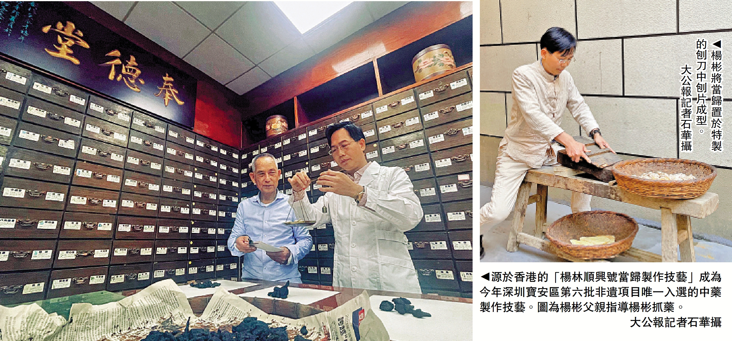 在今年深圳寶安區第六批非遺項目中,「楊林順興號當歸製作技藝」作為唯一的中藥製作技藝入選。這家百年老字號起源於香港,扎根於深圳,不變的是對藥材質量的把控,還有對中醫藥文化的傳承。楊彬,作為「楊林順興號當歸製作技藝」的第五代掌門人,在中醫藥行業沉澱了20餘年,將產品遠銷東南亞、美國、加拿大等地,研發出了當歸湯、當歸飲片等新產品。楊彬通過當歸製作非遺技藝的參觀交流、培訓及新媒體直播等形式,普及中醫藥知識。他說,「我這輩子只做一件事,通過當歸這塊敲門磚,讓中醫藥能夠在百姓家庭得到普及。」/大公報記者 石華