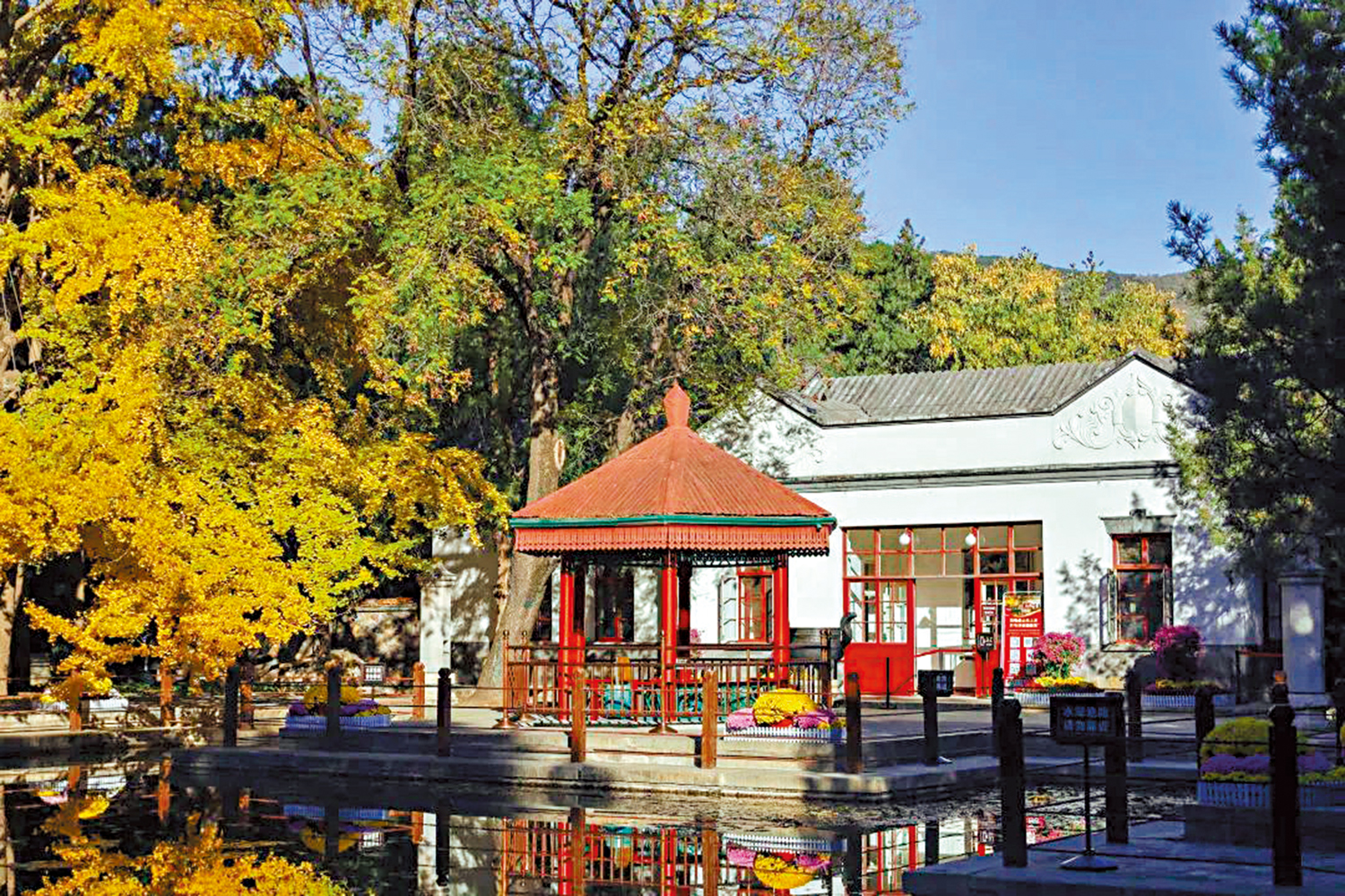 走過「京師之冠」繪彩牌坊,近半山處的岔路口,花叢中橫卧雙清別墅的刻石。啊,來到了仰慕的地方。眾遊人紛紛與刻石合影,看得出興奮之極。一九四九年三月二十五日,毛澤東率中共中央機關由西柏坡進駐香山,這是「進京趕考」的首站,他就住在清代松塢山莊舊址建起的雙清別墅。拾級而上,院門正前是一座六角紅亭,亭子一側有碧水一池,一邊是紅框門窗的白牆平房。進屋瞻觀,物品簡約,正廳擺着幾張沙發和茶几,是會客和開會的場所,一張全國軍事形勢大圖掛在牆中央。廳的兩端,分別是毛澤東的辦公室和卧室,他在這裏度過五個月時光。再出到院中溜達,銀杏似華蓋,翠竹送清風,鳥兒不噪,魚兒不躍,暖陽撒落無數金箔,古老的銅爐、經幢、石台,熠熠生輝。