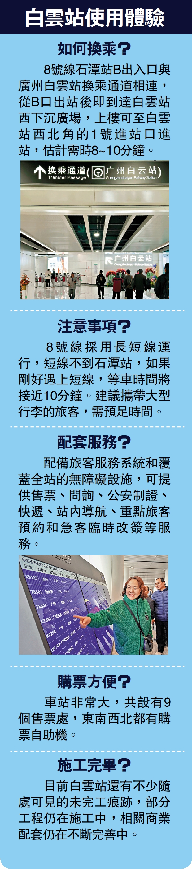 8號線石潭站B出入口與廣州白雲站換乘通道相連,從B口出站後即到達白雲站西下沉廣場,上樓可至白雲站西北角的1號進站口進站,估計需時8~10分鐘。