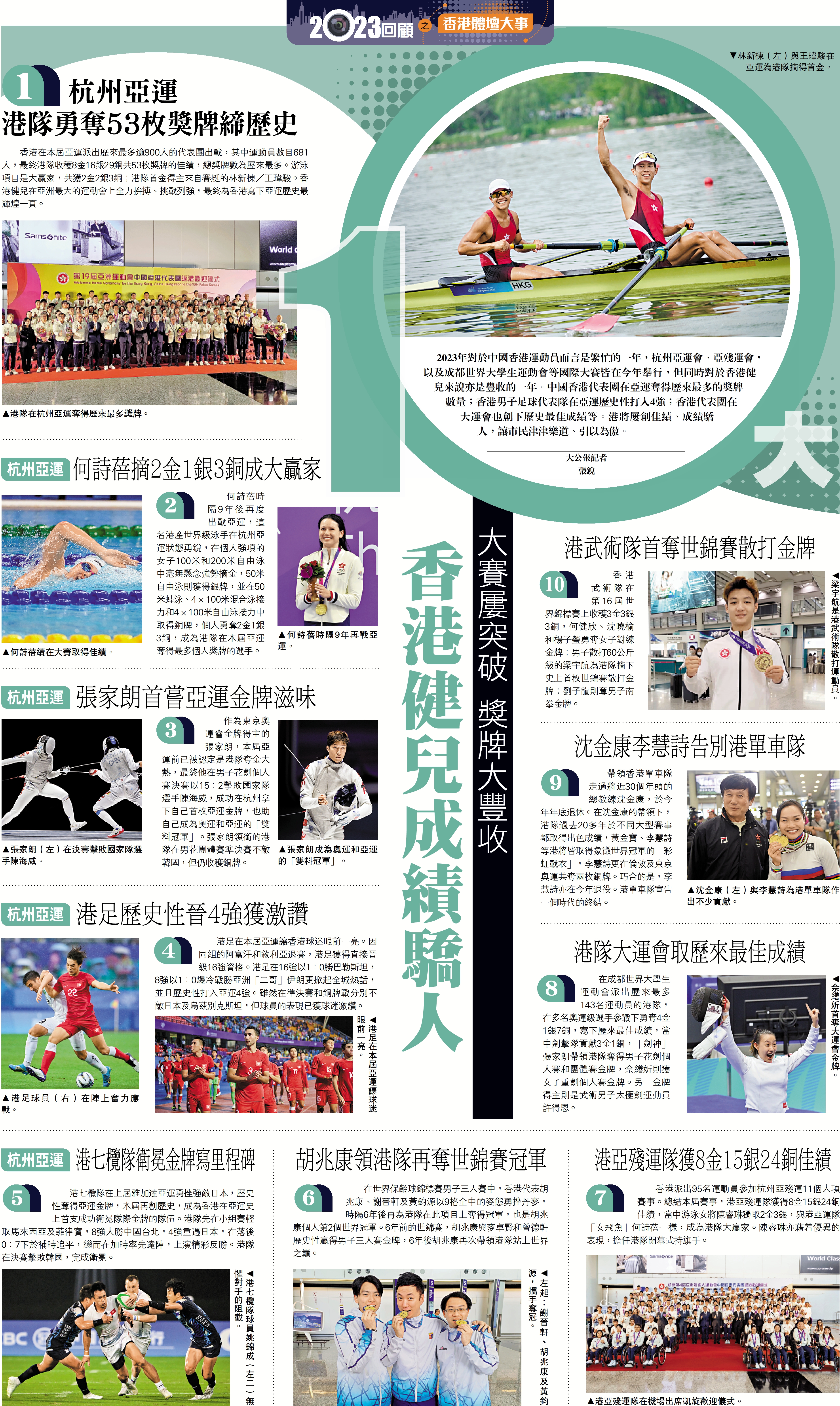 2023年對於中國香港運動員而言是繁忙的一年,杭州亞運會、亞殘運會,以及成都世界大學生運動會等國際大賽皆在今年舉行,但同時對於香港健兒來說亦是豐收的一年。中國香港代表團在亞運奪得歷來最多的獎牌數量;香港男子足球代表隊在亞運歷史性打入4強;香港代表團在大運會也創下歷史最佳成績等。港將屢創佳績、成績驕人,讓市民津津樂道、引以為傲。\大公報記者 張銳