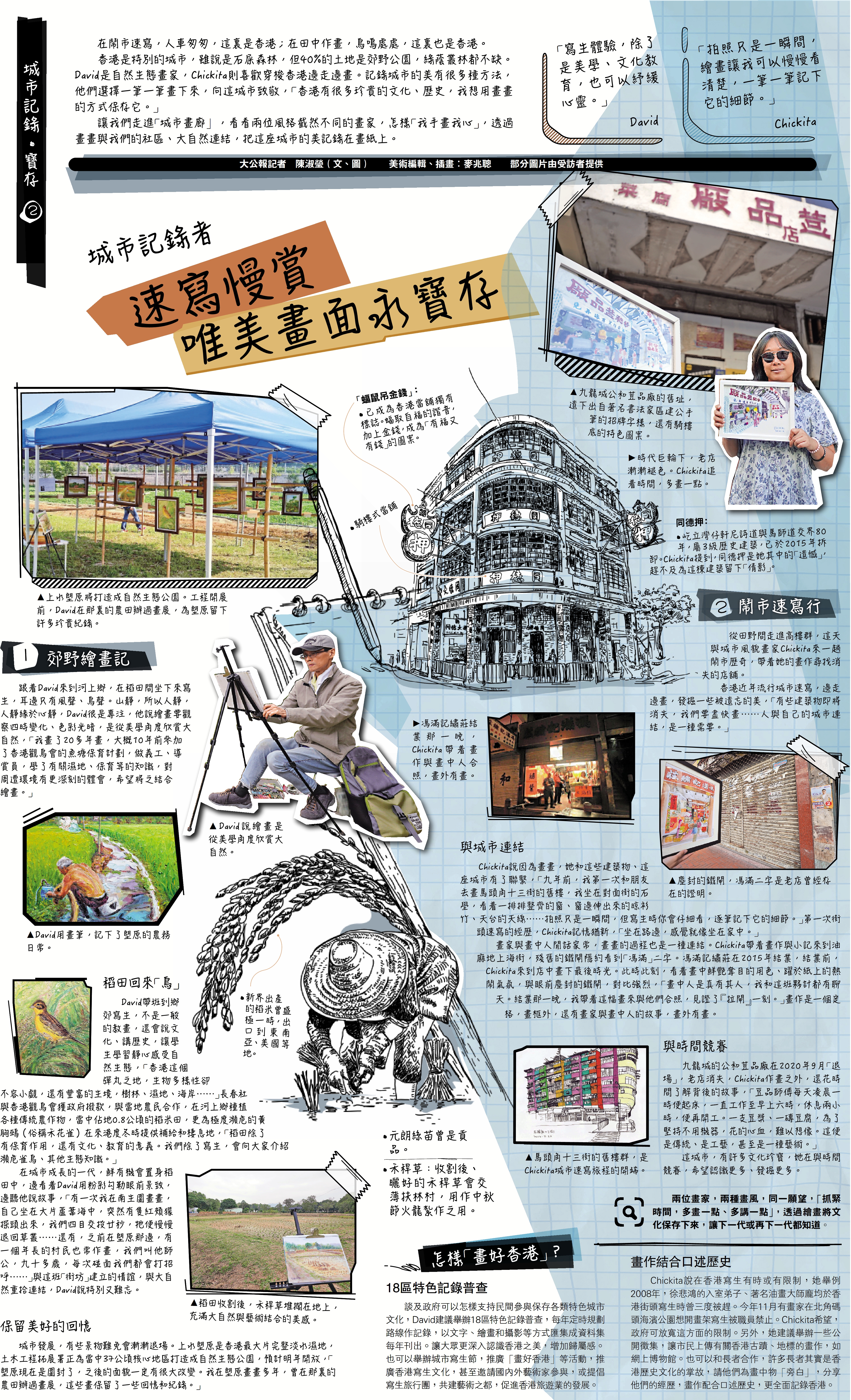 讓我們走進「城市畫廊」,看看兩位風格截然不同的畫家,怎樣「我手畫我心」,透過畫畫與我們的社區、大自然連結,把這座城市的美記錄在畫紙上。\大公報記者 陳淑瑩(文、圖)美術編輯、插畫:麥兆聰 部分圖片由受訪者提供