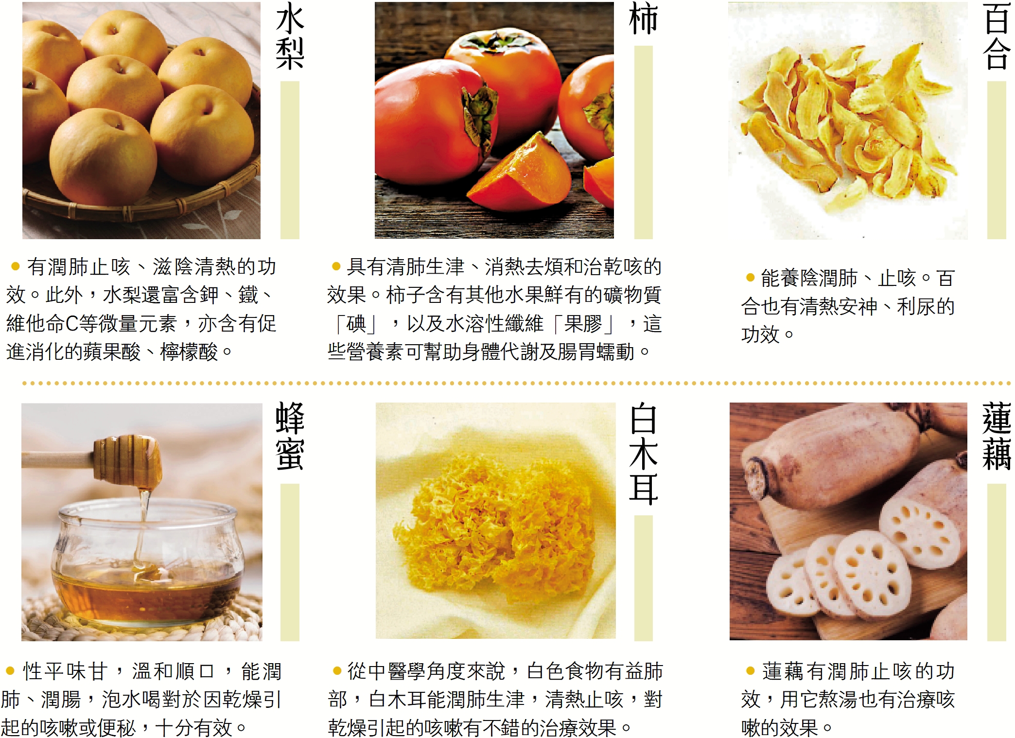 •從中醫學角度來說,白色食物有益肺部,白木耳能潤肺生津,清熱止咳,對乾燥引起的咳嗽有不錯的治療效果。