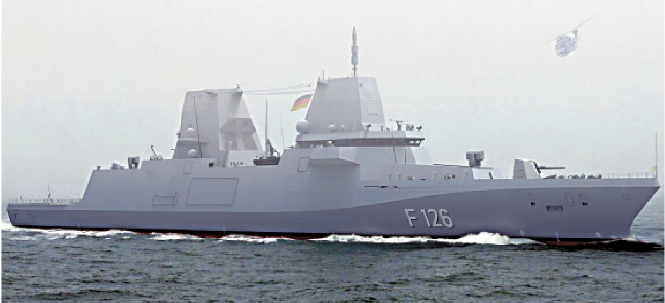 F126型護衛艦全長約166米,滿載排水量達1.1萬噸。這超過了絕大多數驅逐艦的噸位。但其武器配置仍是護衛艦水平,包括一套16單元Mk41垂直導彈發射系統,最多可搭載64枚改進型「海麻雀」Ⅱ型防空導彈。還裝備有NSM反艦導彈、「海拉姆」近程防空導彈系統,以及1門127毫米主炮和2門27毫米機關炮。作為護衛艦,F126型護衛艦將安裝兩套反潛任務模塊,用於遠程反潛和海底測繪等任務。機庫可容納2架艦載直升機。