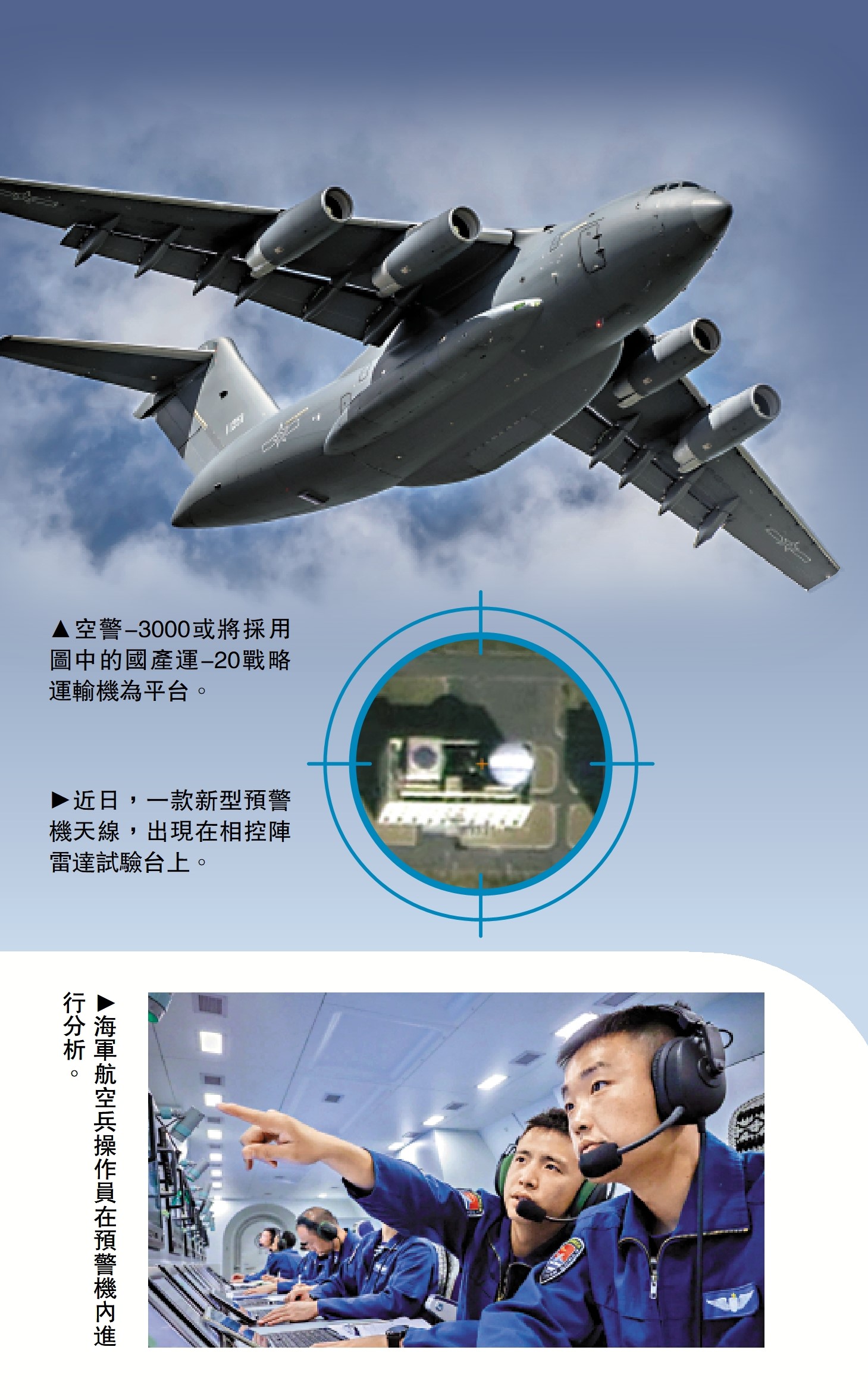 解放軍最新型預警機近日曝光。這款被外界稱為空警-3000的預警機搭載超大孔徑天線,有效增強遠距探測能力,尤其是可更為精準探測識別隱身目標,在空戰對抗中奪得先機,引導殲-20或導彈先發制人;且空警-3000或將採用國產運-20戰略運輸機為平台,能提供超強續航力,亦可加大預警體系的縱深。功能更強大的「空天中軍帳」,將有效提高指揮調度效能。\馬浩亮(文)