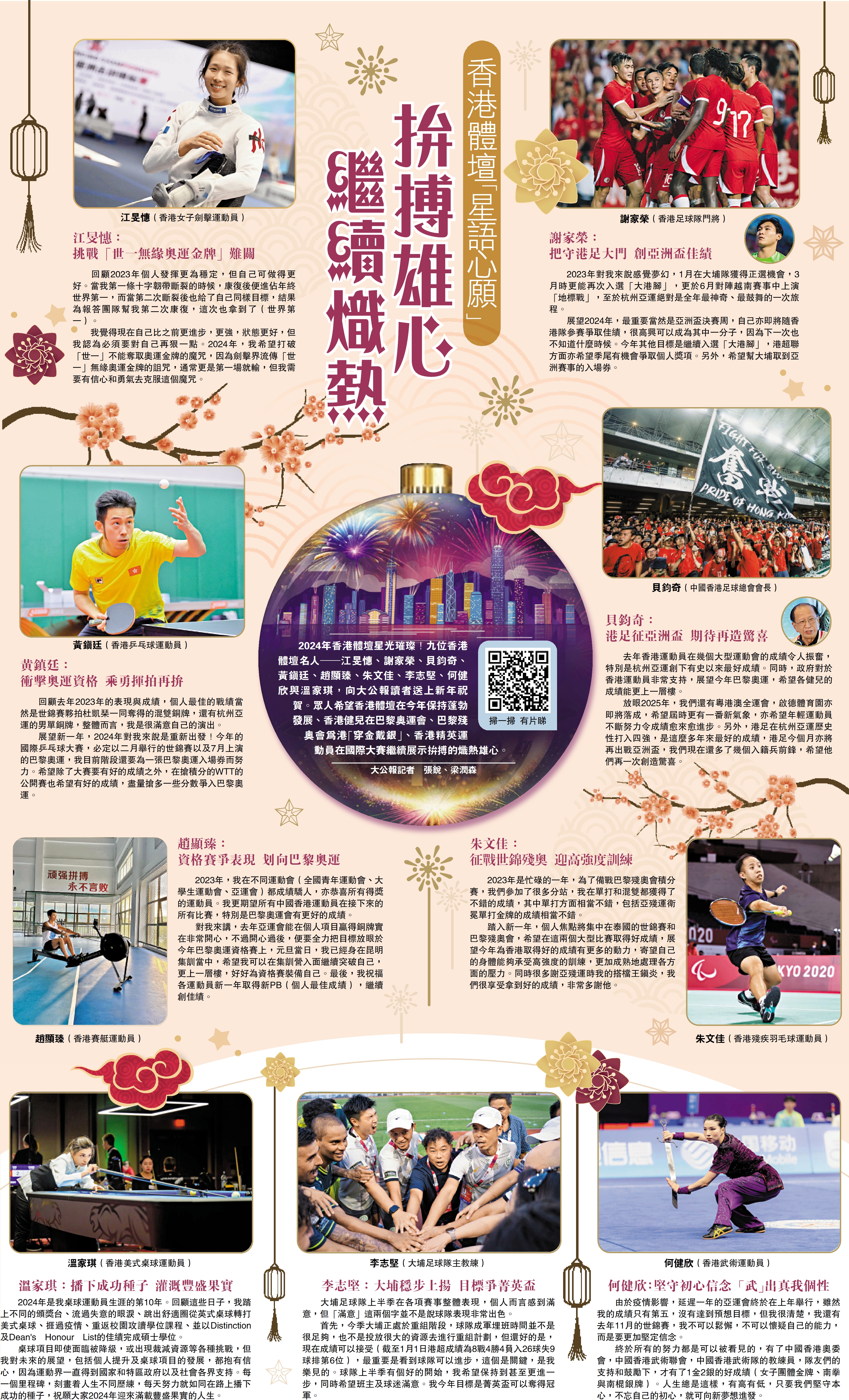 2024年香港體壇星光璀璨!九位香港體壇名人─江旻憓、謝家榮、貝鈞奇、黃鎮廷、趙顯臻、朱文佳、李志堅、何健欣與溫家琪,向大公報讀者送上新年祝賀。眾人希望香港體壇在今年保持蓬勃發展、香港健兒在巴黎奧運會、巴黎殘奧會為港「穿金戴銀」、香港精英運動員在國際大賽繼續展示拚搏的熾熱雄心。
