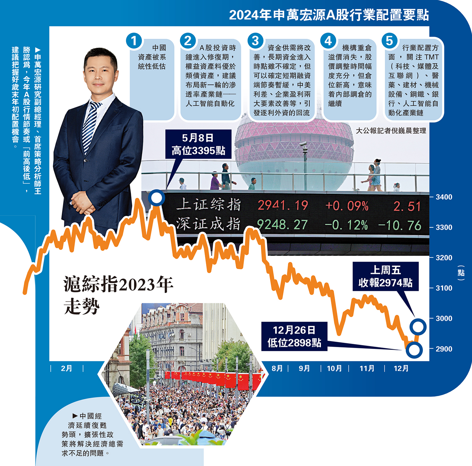 申萬宏源研究副總經理、首席策略分析師王勝向《大公報》表示,從地產經濟到消費製造經濟的「過渡期」可能較長,A股市場尚不具備「增量博弈」基礎,加之經濟新範式的確立需要時間,A股牛市仍需耐心等待。不過,隨着美聯儲加息周期的結束,美債收益率有望下行,A股投資時鐘進入修復階段。他並指,在中美經貿關係改善、中國出口韌性猶存,以及穩增長政策加碼且效力提升背景下,2024年A股行情節奏或「前高後低」,建議把握好歲末年初配置機會,短期超配A股、中期標配A股。\大公報記者 倪巍晨