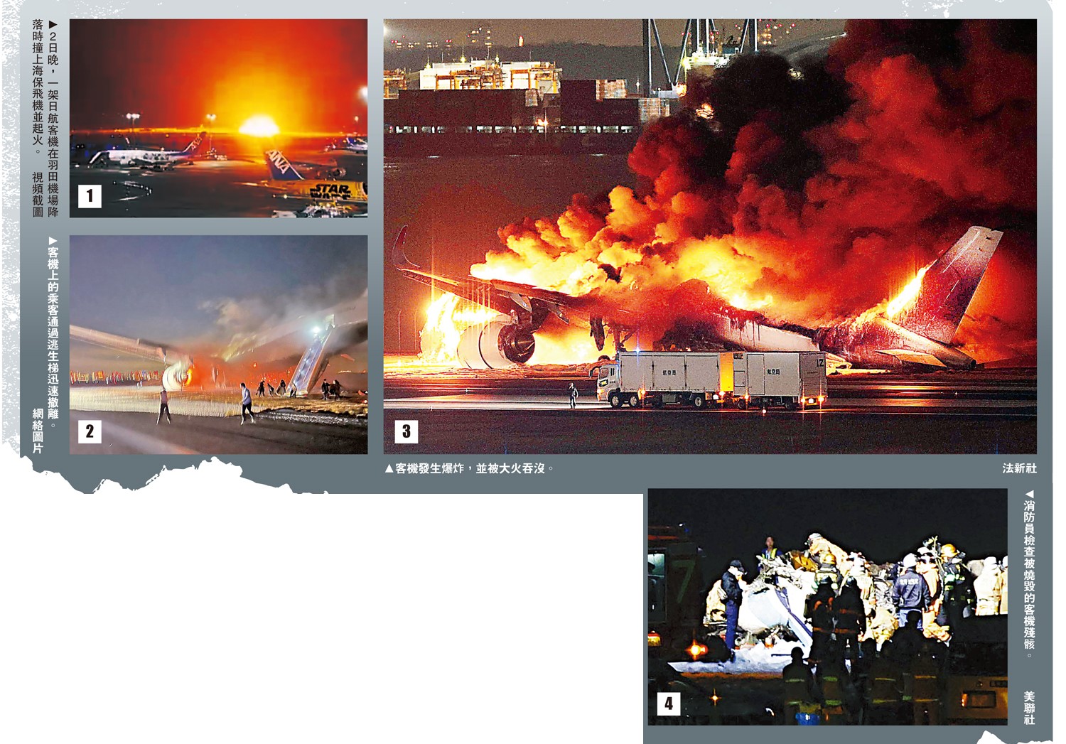 【大公報訊】綜合共同社、NHK、美聯社報道:當地時間2日下午,日本東京都羽田機場發生重大事故,日本航空公司516航班降落時在跑道上與一架準備起飛的海上保安廳(下稱海保)救災飛機相撞,引發爆炸和大火。客機上乘客和機組成員共計379人全部撤離,其中14人受傷;海保飛機機長重傷,另外5人罹難。本港入境處接獲10名搭乘事發客機的港人求助,並確認他們目前身處安全地方。一名港人乘客回憶說,他逃出機艙後不久,飛機引擎便發生爆炸,情況驚險萬分。