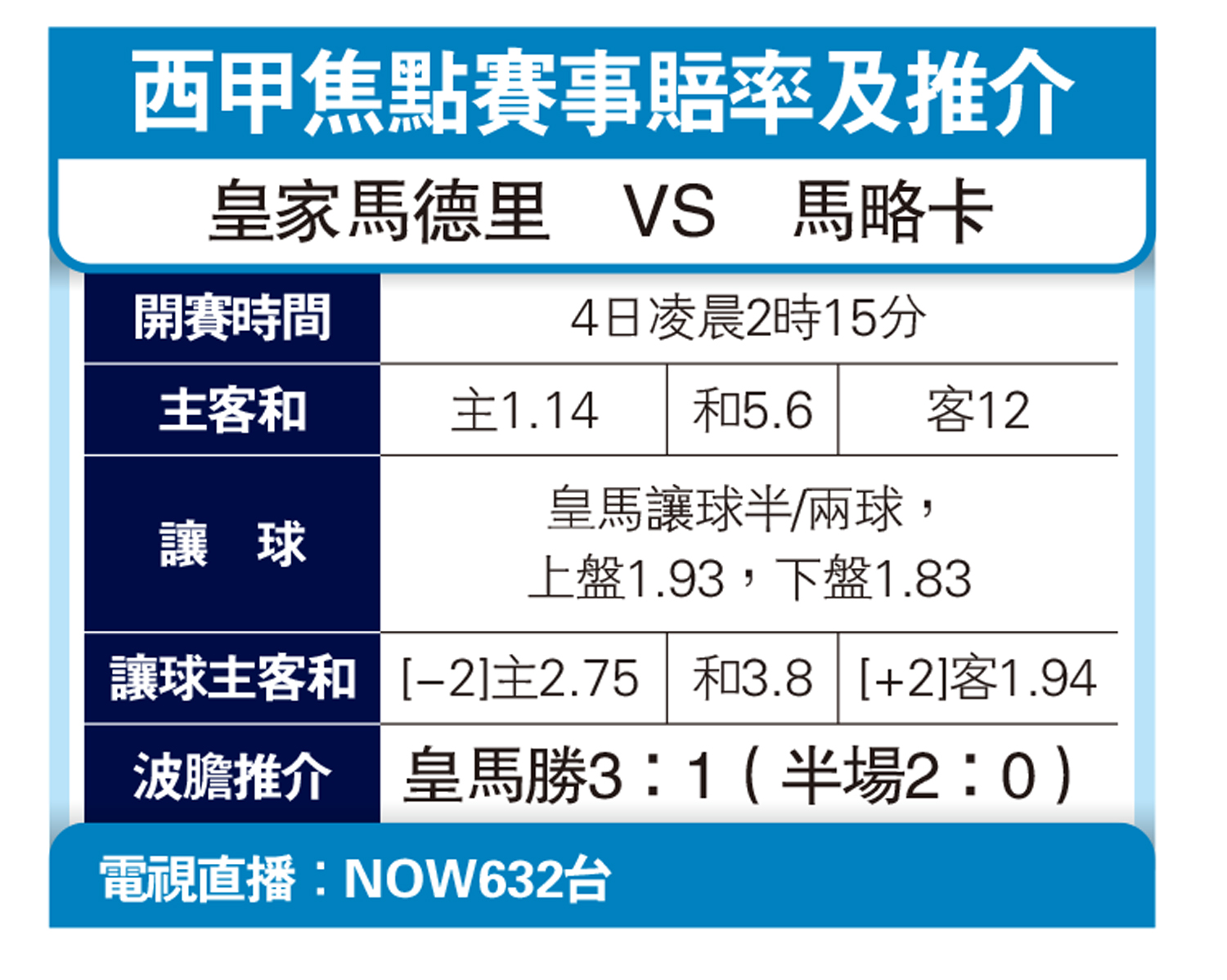 皇馬在爭勝之餘更可能收到漁人之利,皆因稍後時間基羅納會在主場大戰第4位的馬德里體育會,後者有實力令基羅納失分,「讓球」平手盤下,取客隊馬體會保本增值。(NOW632台明晨4時30分直播)