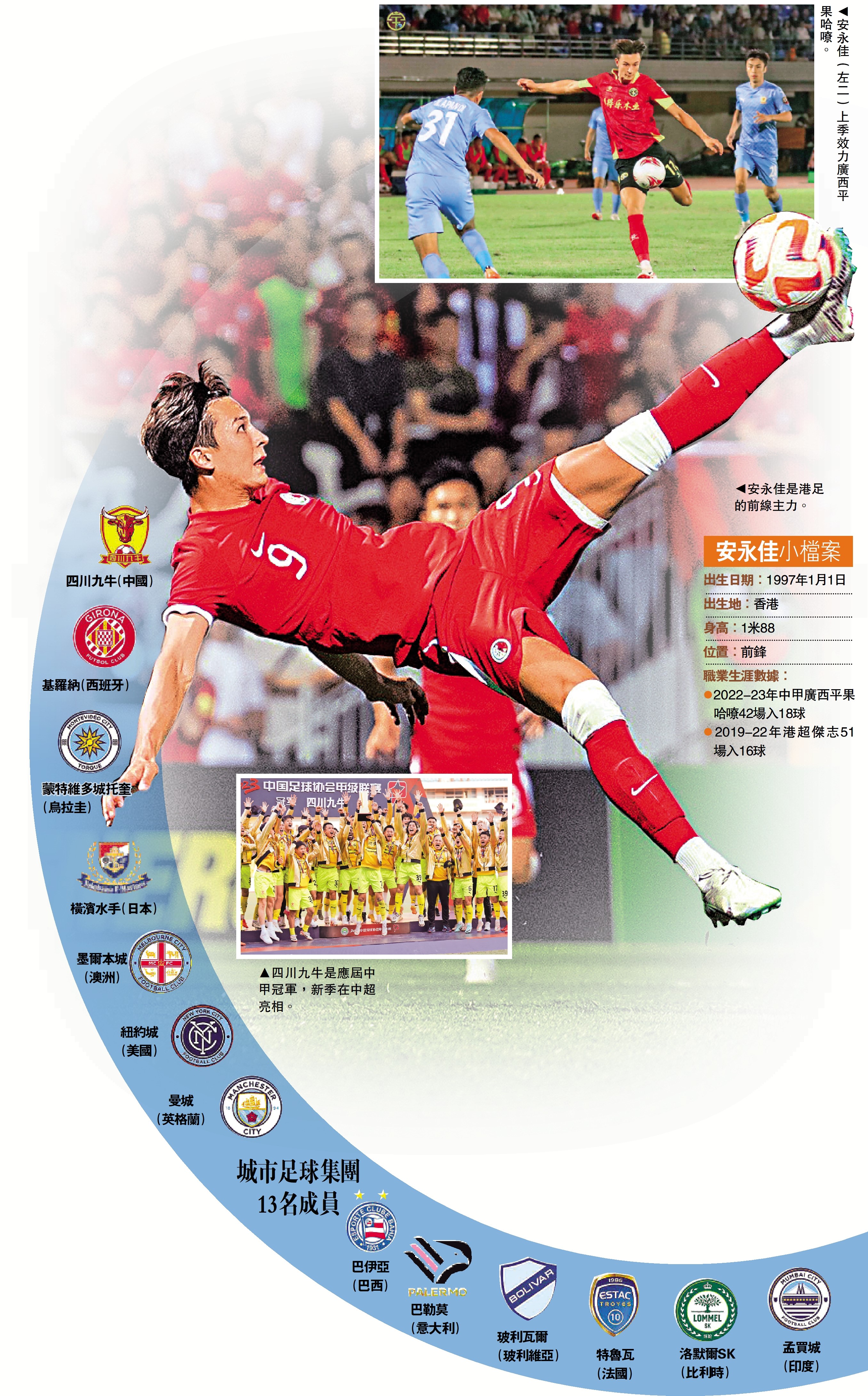 中國甲組足球聯賽昨天公布2023年年度獎項評選結果,其中上季效力廣西平果哈嘹的中國香港足球代表隊前鋒安永佳,獲選為年度最佳球員,兼成功入選最佳陣容。安永佳在一周前發表離隊感言,證實離開平果哈嘹。剛巧在亞洲盃官方公布的參賽球員名單上,就已顯示安永佳所屬球會為中超新軍四川九牛,意味着該名剛滿27歲的港足鋒將圓中超夢,新東家更是跟曼城同屬城市足球集團的旗下一員。\大公報記者 張銳
