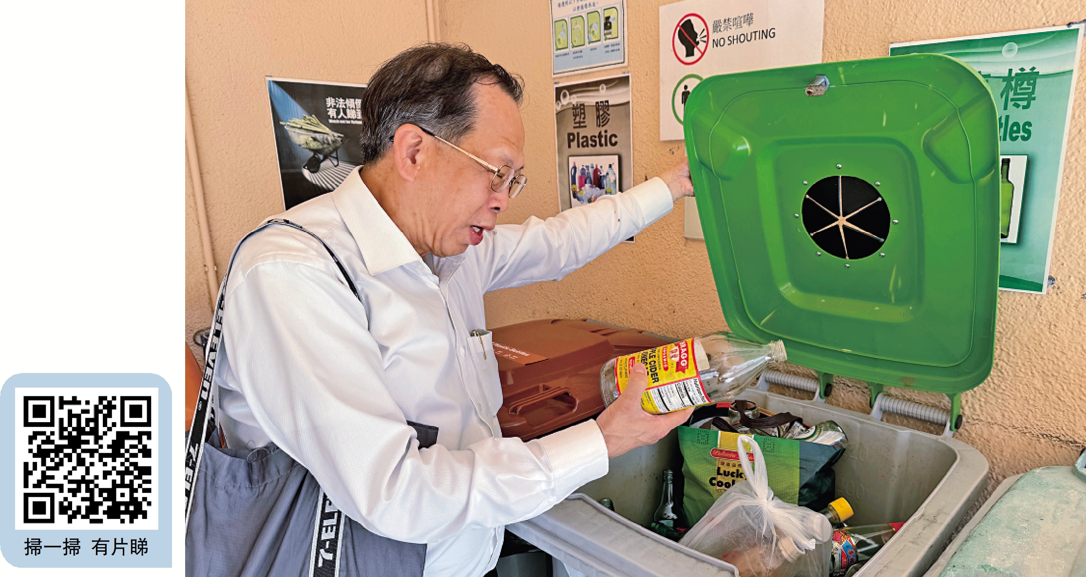 淘大花園業委會(第二期)主席葉興國查看屋苑的回收設施,他表示,試點計劃成功令六成住戶習慣使用指定膠袋。