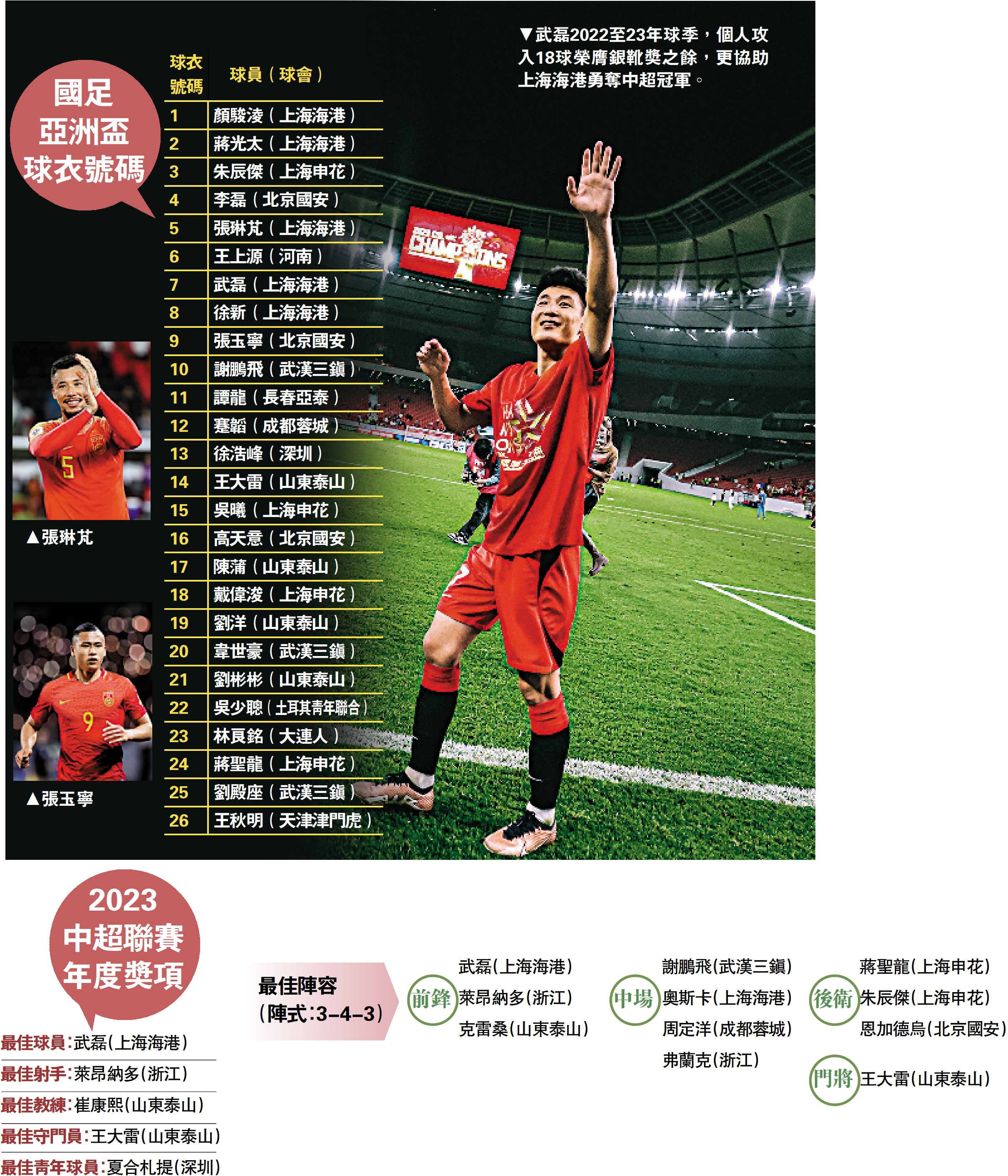 【大公報訊】中超聯賽組委會在4日公布了2023年度中超賽季年度獎項評選結果,效力上海上港隊的國足前鋒武磊榮膺最佳球員,浙江隊的外援萊昂納多當選年度最佳射手,山東泰山隊的韓國籍主帥崔康熙獲評為年度最佳教練,而該隊的國腳門將王大雷亦獲選為最佳門將。