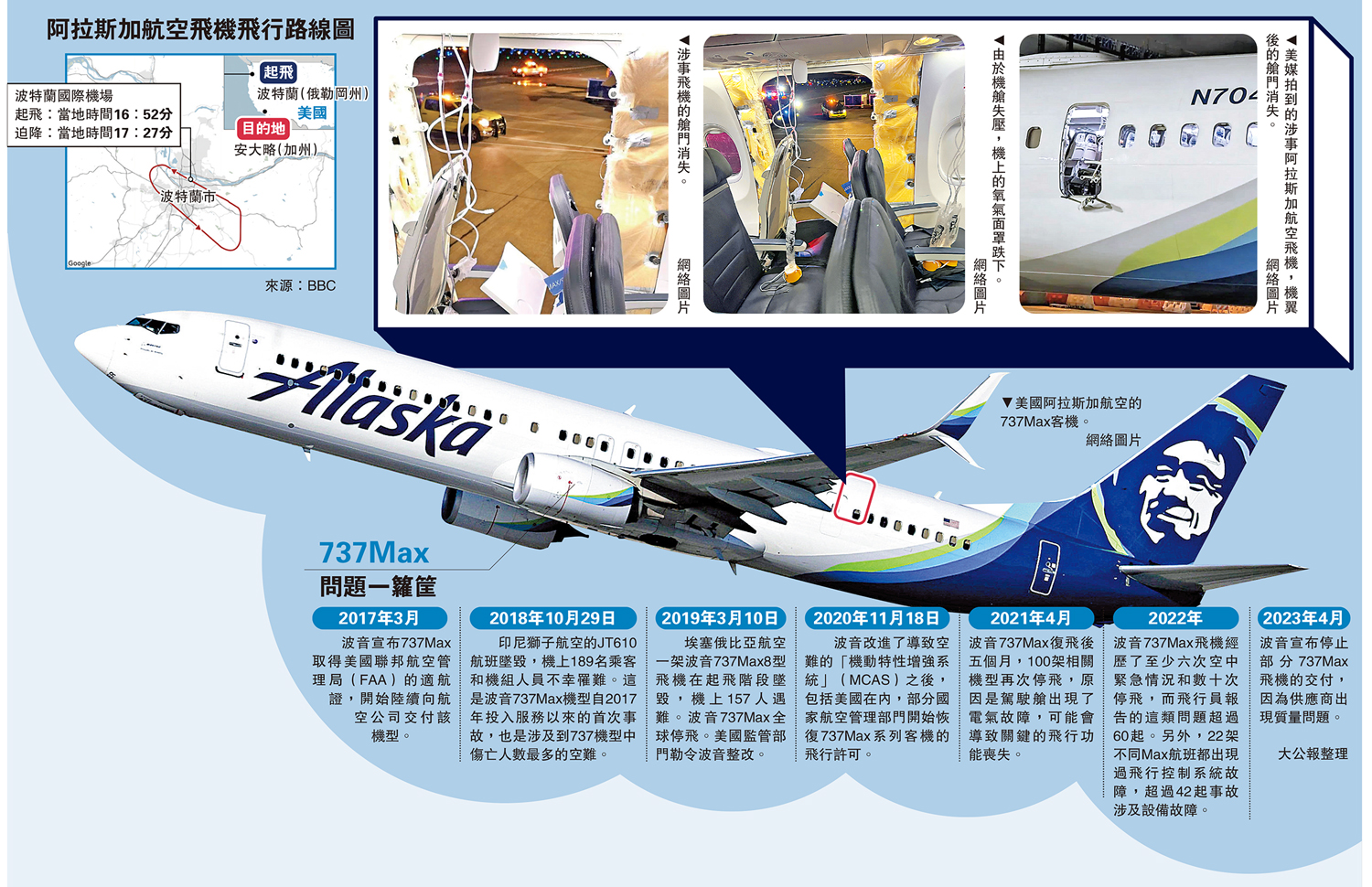 【大公報訊】綜合美聯社、CNN、路透社報道:美國阿拉斯加航空公司(Alaska Airlines)一架波音737Max 9機型客機,5日起飛不久在空中發生事故,突然有一扇艙門被吹落,最後緊急迫降返回起飛的機場,未造成人員傷亡。在事故發生後,阿拉斯加航空公司宣布將停飛該公司所有同型號飛機。