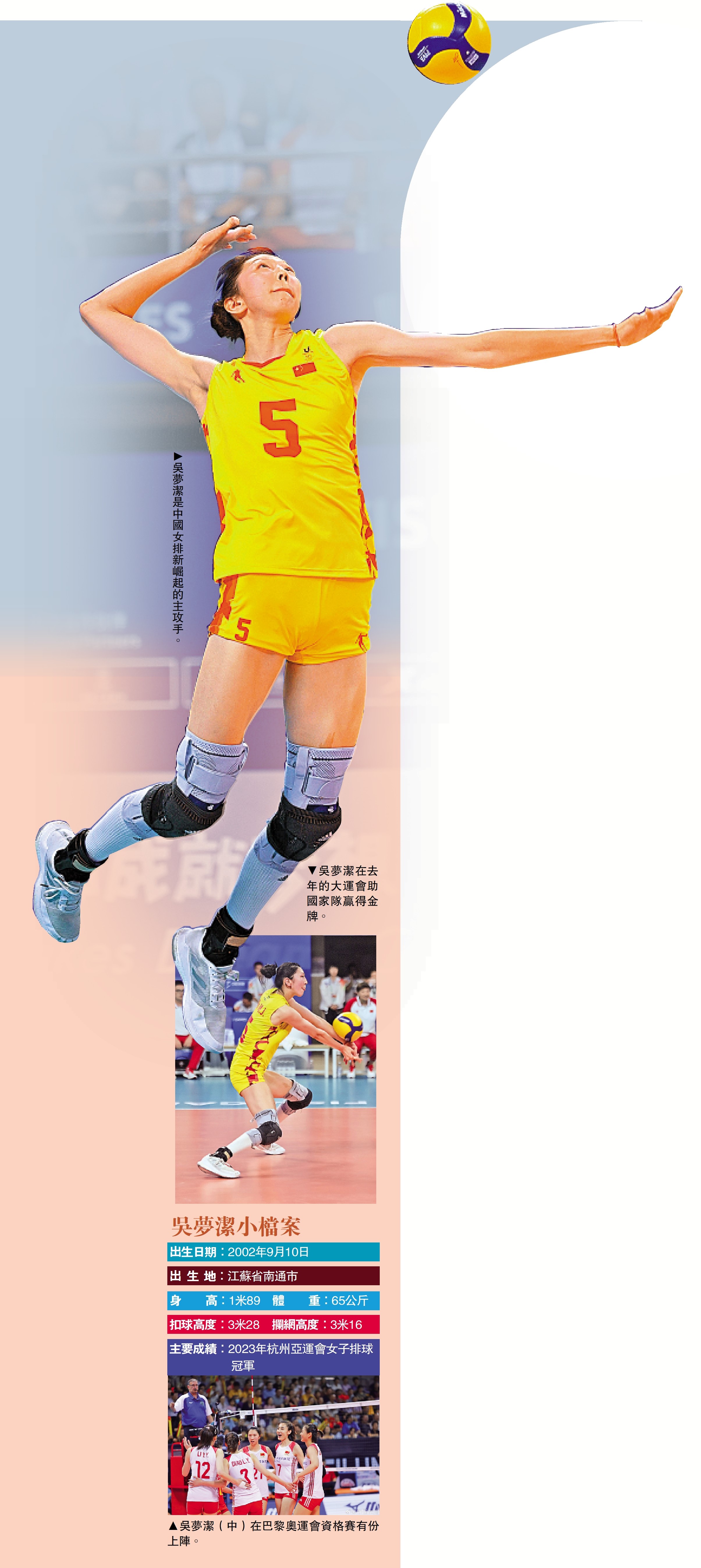在2023-2024年賽季中國女子排球超級聯賽中,來自江蘇隊的年輕主攻手吳夢潔表現出色。在排超聯賽第一階段比賽中,吳夢潔在最佳得分手的榜單中,以233分名列中國本土選手第一位,並在發球、扣球榜單上名列全部球員前10位。身高近1米90、扣球高度達到3米28的吳夢潔,正在成為中國女排主攻線上一顆冉冉升起的新星,有望成為未來中國女排隊中摧城拔寨的重炮手。\大公報特約記者 史玄之