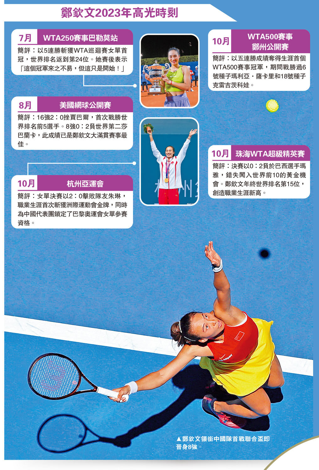 在2023賽季,鄭欽文經歷不少高光時刻,她坦言自己成長最多的就是心態,「我現在盡量使自己保持比較平靜穩定(的心態),但同時在球場上也不失進攻的犀利,我也還在慢慢地尋找怎麼樣做到最好的自己。」