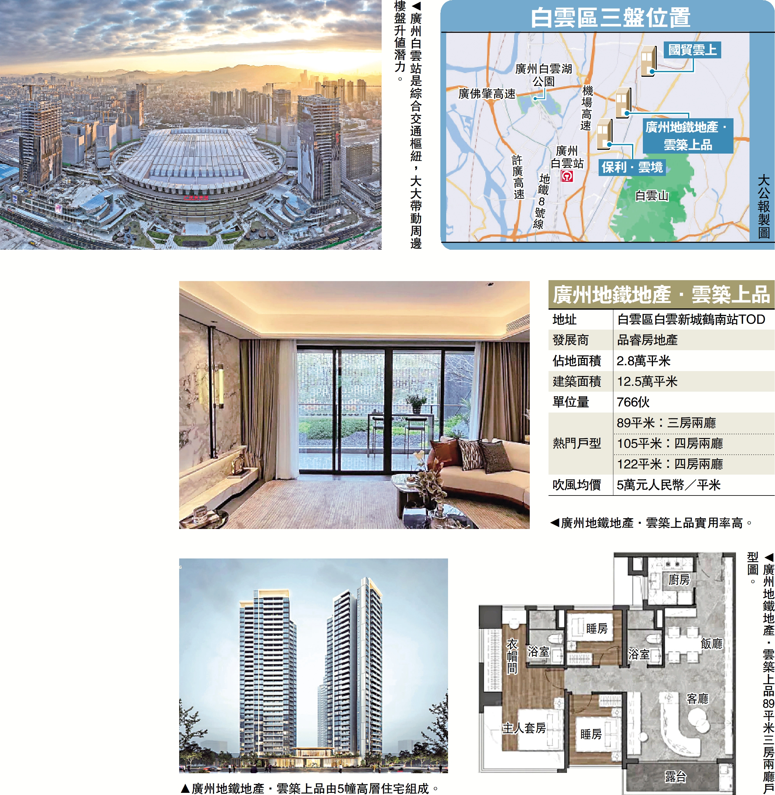 亞洲最大火車站之一的高鐵廣州白雲站在上月26日正式開通,將京廣高鐵引入廣州城區。白雲站是普速、高鐵、城際交通一體化換乘的綜合交通樞紐,大大縮短了粵港澳大灣區核心城市之間的交通往來。港人可從西九龍站出發,到廣州東即可換乘到白雲站,只需約兩小時,為港人到該片區看房帶來便利。白雲站周邊有多個新樓盤,其中廣州地鐵地產·雲築上品(下稱「雲築上品」)首期推出89至122平米戶型,吹風價每平米約5萬元(人民幣,下同;約5.49萬港元),以高使用率為亮點。\大公報記者 盧靜怡廣州報道
