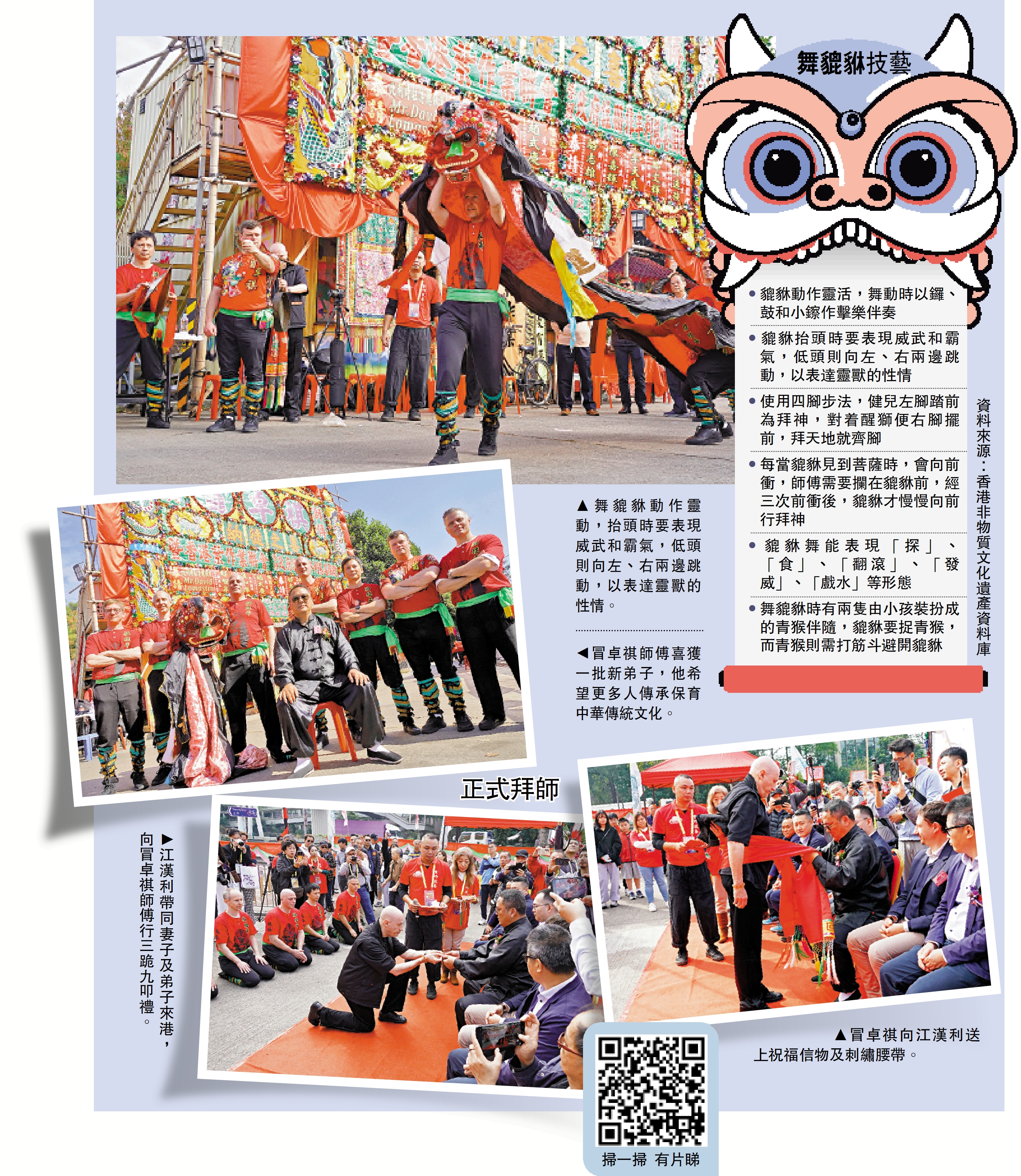 「舞貔貅比較冷門,現在學的人已經相對少。」談起貔貅舞的傳承,冒師傅有些無奈,但談到江漢利和他帶來的一班弟子,冒師傅重展歡顏,「他們從歐洲來港拜師學習貔貅舞,可見對武術的尊重,對中國文化的喜愛,很值得我們本身作為華人學習。」