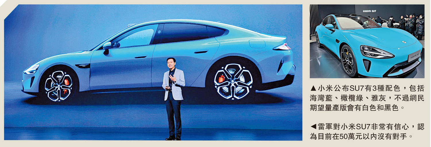 較早前,雷軍一度在網民評論中回覆:「(小米汽車)50萬元以內,有對手嗎?」小米汽車表示,雖然是玩笑話,但也是認真的,小米比較務實,「不會立那些離譜的flag(網絡用詞,意指立下目標)」,小米汽車非常有信心,小米SU7目前在50萬元以內沒有對手。