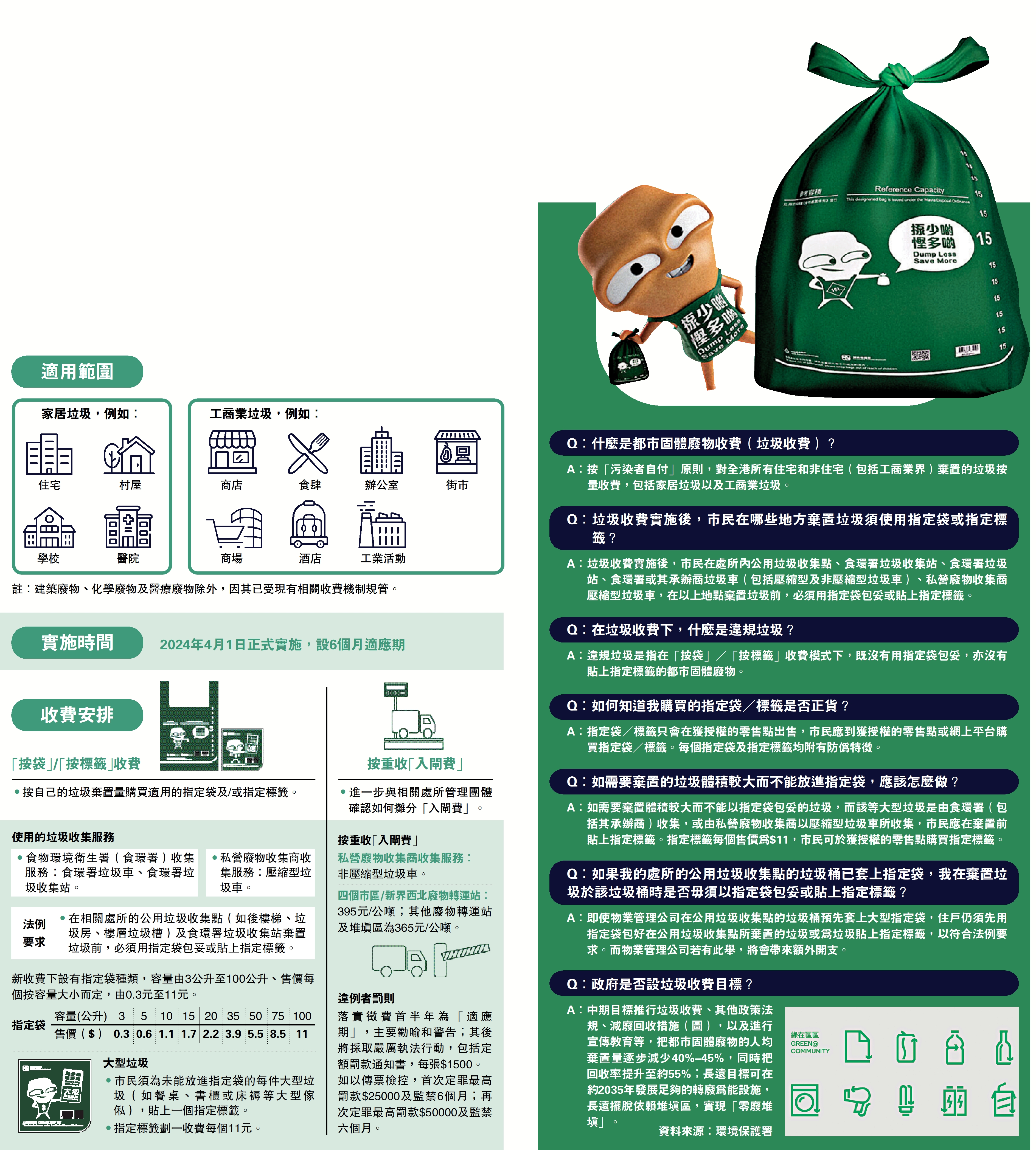 A:按「污染者自付」原則,對全港所有住宅和非住宅(包括工商業界)棄置的垃圾按量收費,包括家居垃圾以及工商業垃圾。