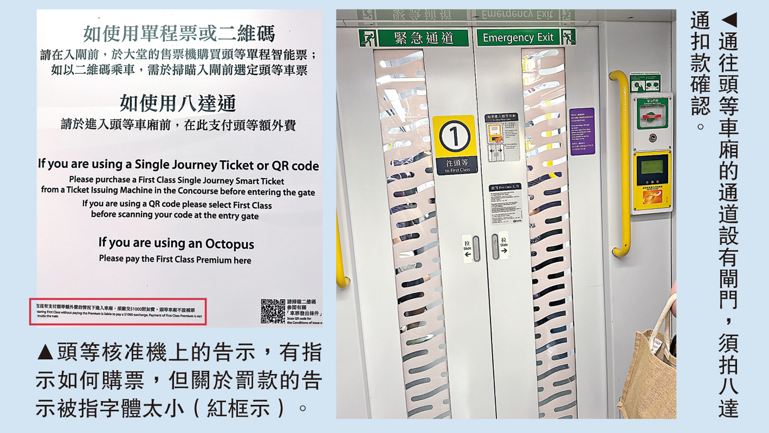港鐵回覆《大公報》表示,港鐵的顧客服務及收益保護組專責執行查票職務,每日在網絡內不同地方查票,包括港鐵站、東鐵綫頭等車廂以及輕鐵。當中在東鐵綫頭等車廂進行查票時,港鐵人員會要求車廂內所有乘客(不論本地乘客或旅客)出示頭等單程票、八達通或二維碼,如乘客未能出示有效的頭等車票,人員會根據《香港鐵路附例》向乘客徵收1000元附加費。東鐵綫車站的客務中心及售票機均有列出頭等額外費用的資訊,而東鐵綫車站月台頭等車廂等候區,以及列車車廂內多個當眼位置亦貼有告示,包括近期新設計的宣傳告示,提醒乘客使用頭等車廂須持有有效的頭等車票。