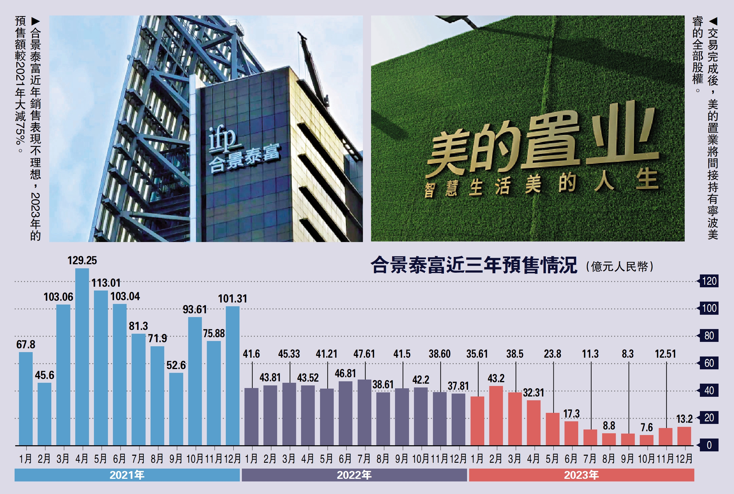 參考合景泰富近年銷售表現。據統計,2021年預售額達1038.4億元,2022年則減半至508.6億元,2023年再度減半至252.4億元,其中在去年8月、9月和10月的當月預售額更跌破10億元,而在2021年,該3個月的預售額分別有52.6億至93.61億元。