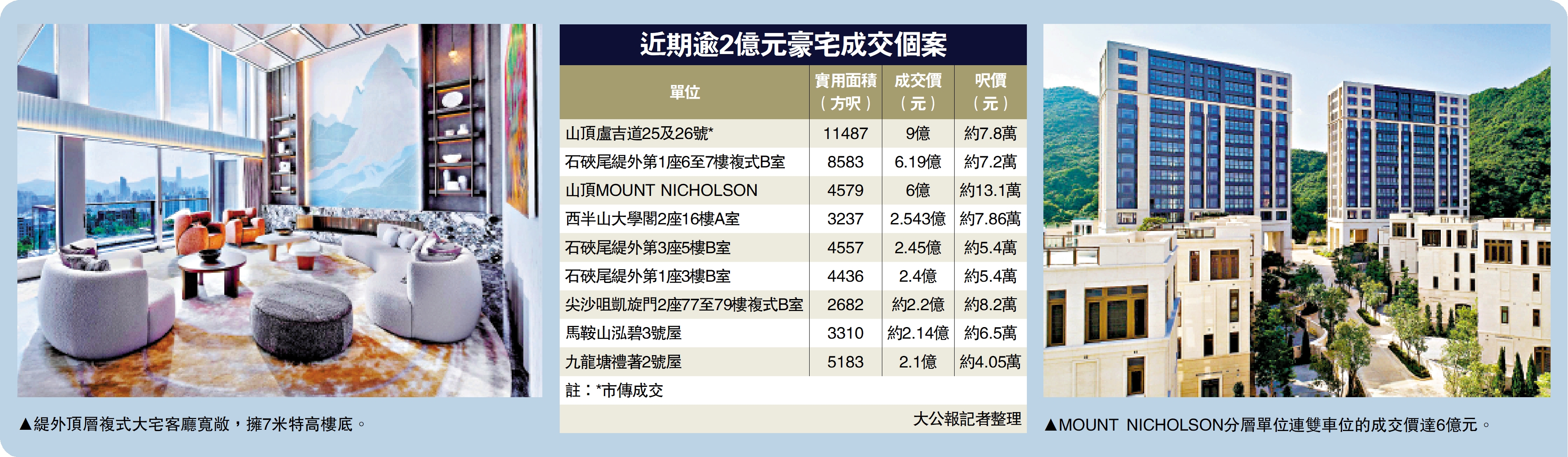 本港經濟復甦不似預期,整體樓市近期才反覆回穩,然而最近豪宅市場卻頻出現逾億元貴價成交,最新是山頂MOUNT NICHOLSON及石硤尾緹外,各錄1宗達6億元的一手成交,緹外的頂層複式單位,更料創九龍區分層單位新高價。/大公報記者 林志光