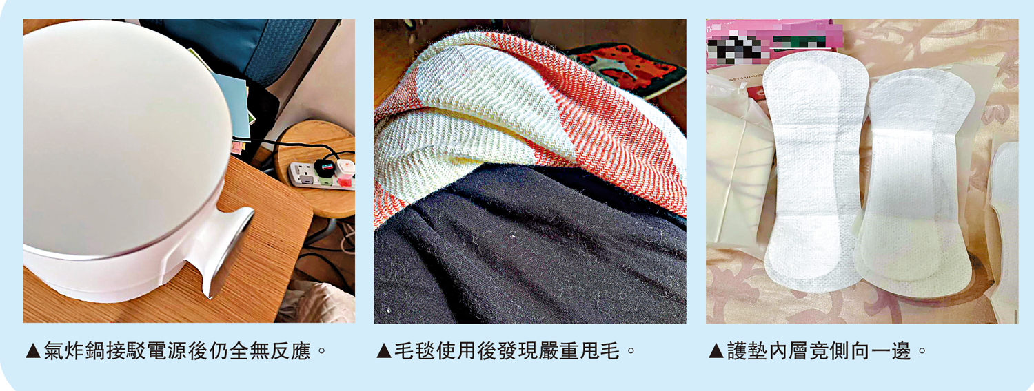 有港人購買一款氣炸鍋,使用時發現無反應,嘗試自行換掉插頭再試,仍然無法使用。有網民指出,兩地的電器插口掣式不同,購買前應了解清楚,就算產品出問題,由於發帖者已經自行改裝插頭,將無法退貨;也有人展示一款毛毯,表示使用後發現嚴重甩毛,形容「搞到全身都係,好鬼煩」。