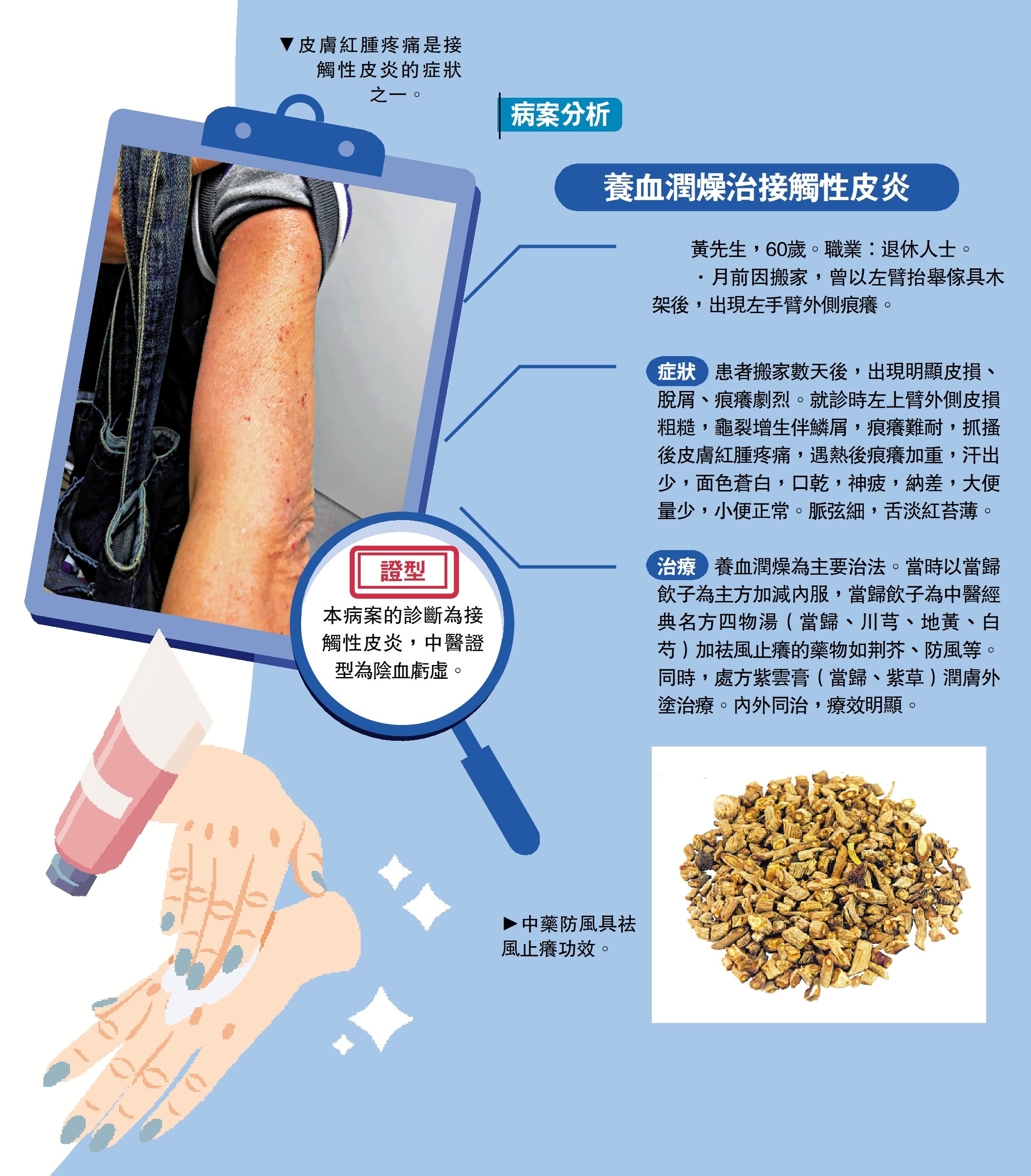 症狀 患者搬家數天後,出現明顯皮損、脫屑、痕癢劇烈。就診時左上臂外側皮損粗糙,龜裂增生伴鱗屑,痕癢難耐,抓搔後皮膚紅腫疼痛,遇熱後痕癢加重,汗出少,面色蒼白,口乾,神疲,納差,大便量少,小便正常。脈弦細,舌淡紅苔薄。