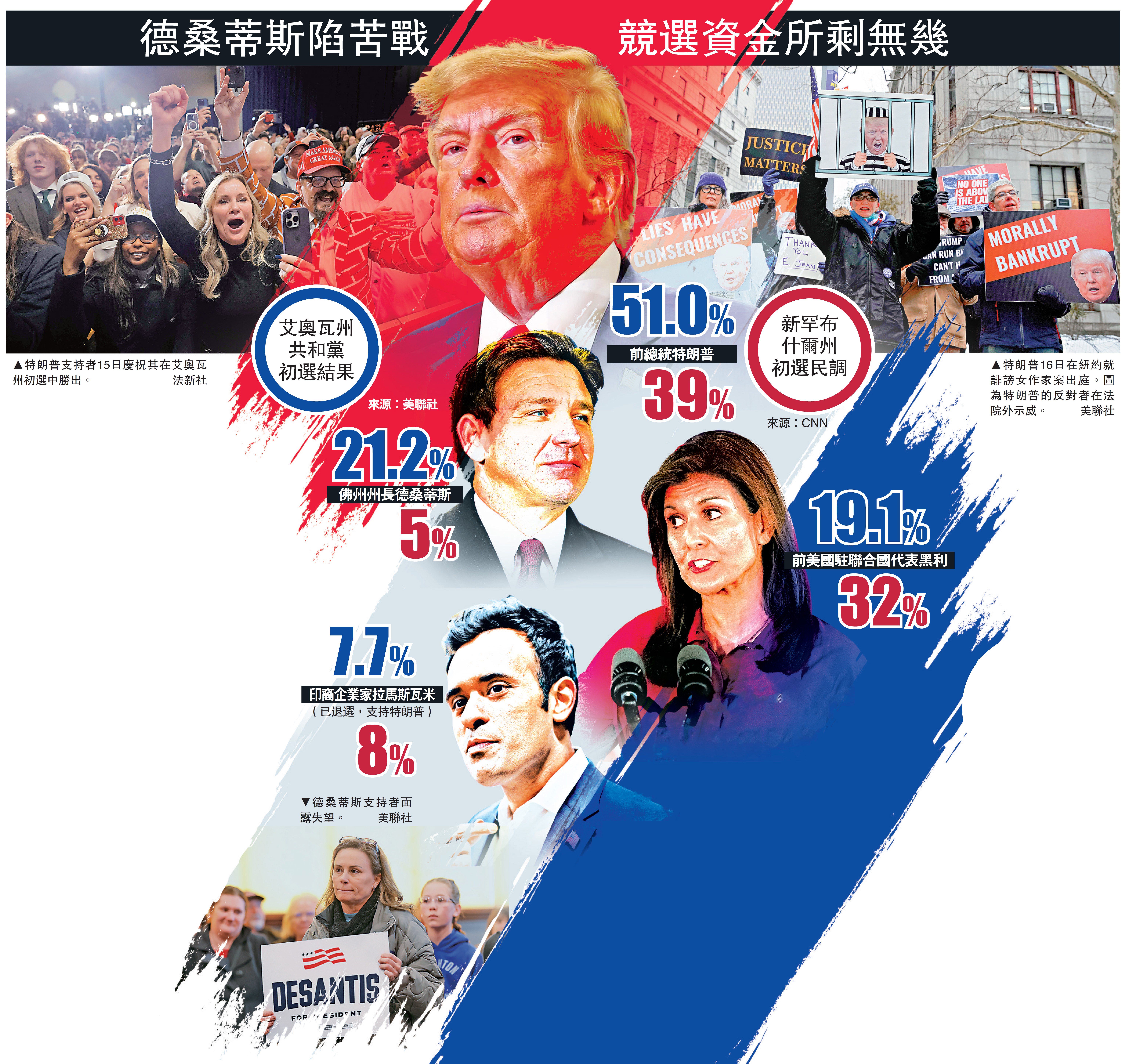 CNN日前公布的民調顯示,特朗普在該州共和黨選民中的支持率為39%,黑利支持率為32%,德桑蒂斯僅為5%。德桑蒂斯最初以特朗普頭號勁敵的身份參加初選,如今卻陷入困境。《紐時》稱,德桑蒂斯的競選資金所剩無幾,似乎已放棄新罕布什爾州,準備直接去南卡羅來納州拉票。