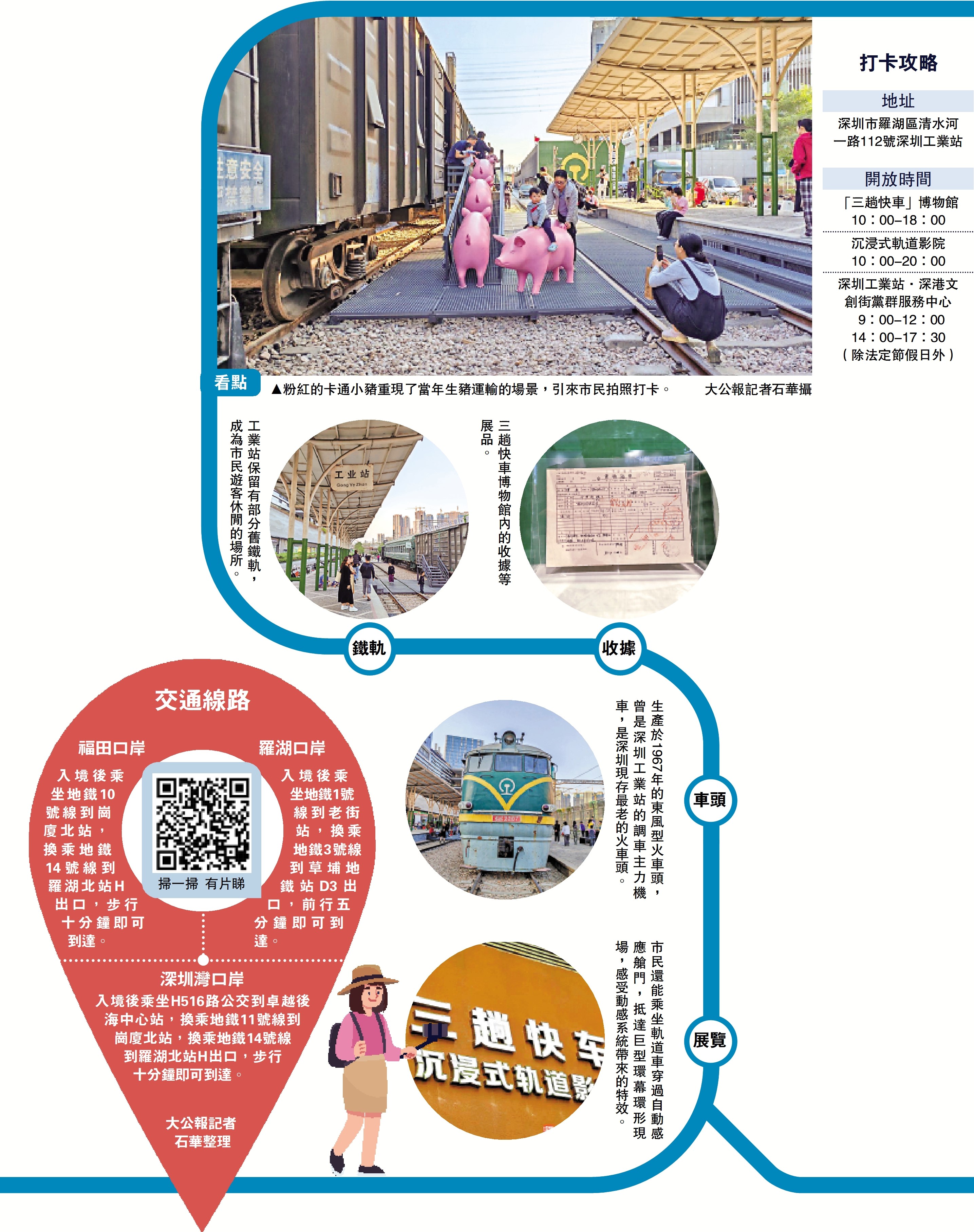 在深圳羅湖區草埔有一個火車站——深圳工業站,曾是廣州與九龍之間的經停站,工業站曾是供港物資在內地的最後一個中轉站。從1962年到2010年,「三趟快車」將鮮活物資運送至香港,源源不斷地為香港市民提供新鮮的食料。如今,這個車站已經失去了物流功能,這個承載着內地與香港之間深情厚誼的城市發展遺跡,被打造成深圳首個以深港、愛國為基礎,以文化創意和傳統民俗為主題的人文景點。去年12月28日,「深圳工業站·深港文化創藝街」開街以來,吸引眾多歷史愛好者、火車迷和攝影愛好者在此打卡。\大公報記者 石華深圳報道