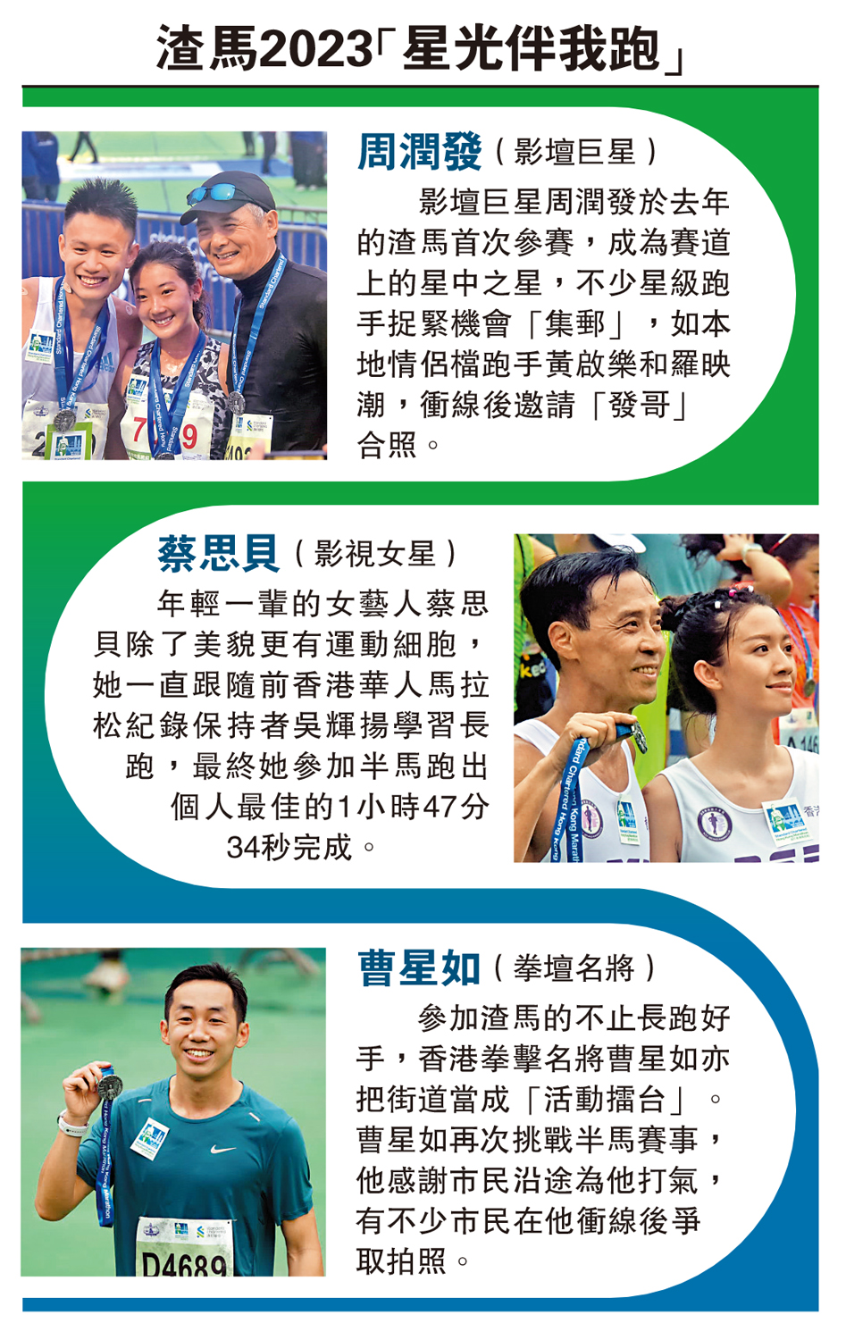 影壇巨星周潤發於去年的渣馬首次參賽,成為賽道上的星中之星,不少星級跑手捉緊機會「集郵」,如本地情侶檔跑手黃啟樂和羅映潮,衝線後邀請「發哥」合照。