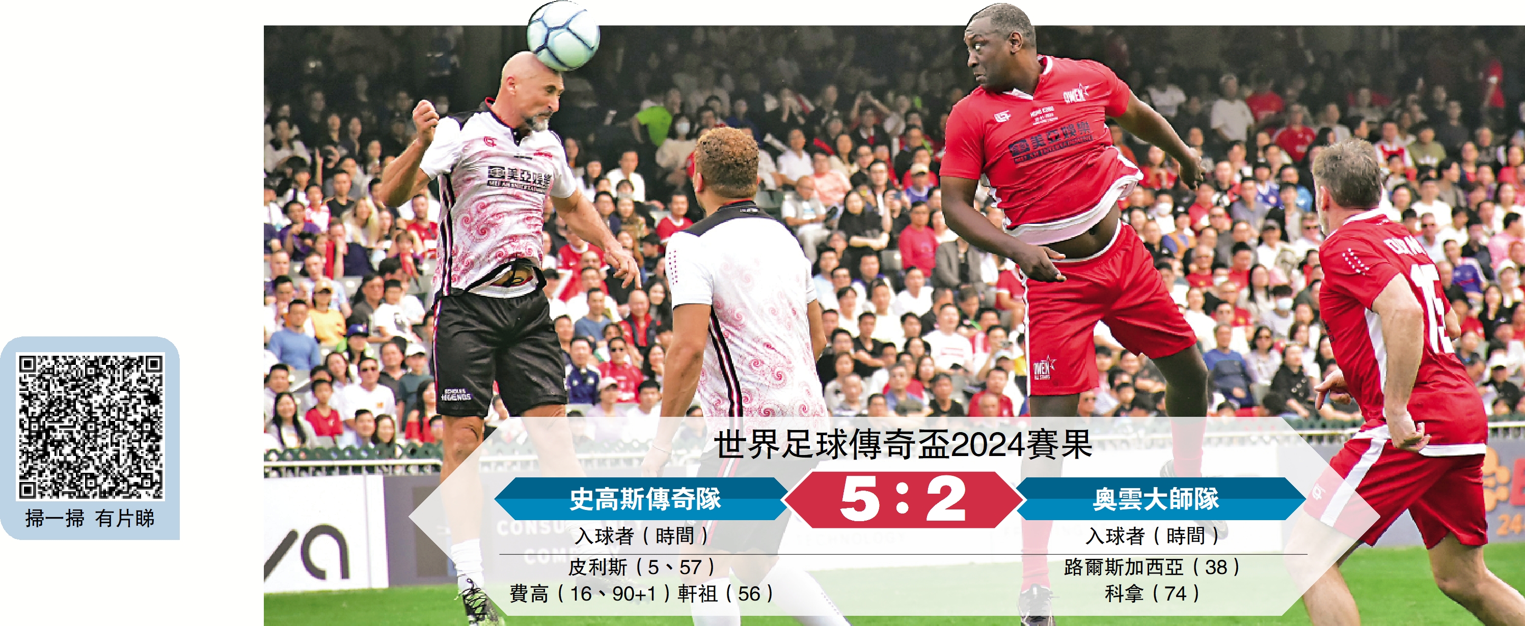 世界足球傳奇盃昨午在香港大球場隆重上演,由奧雲大師隊對陣史高斯傳奇隊。曾經效力西甲雙雄巴塞隆拿和皇家馬德里的葡萄牙名宿費高,加上英超阿仙奴的法國名宿皮利斯,兩人分別為史高斯隊建功,加上阿士東維拉名宿軒祖的精彩笠射,最終助史高斯隊以5:2勝出,為現場近15000名球迷奉獻一場精彩賽事。主持開球禮的文化體育及旅遊局局長楊潤雄,盛讚賽事好氣氛,亦為香港一連串足球盛事揭開序幕。\大公報記者 張銳(文、圖)