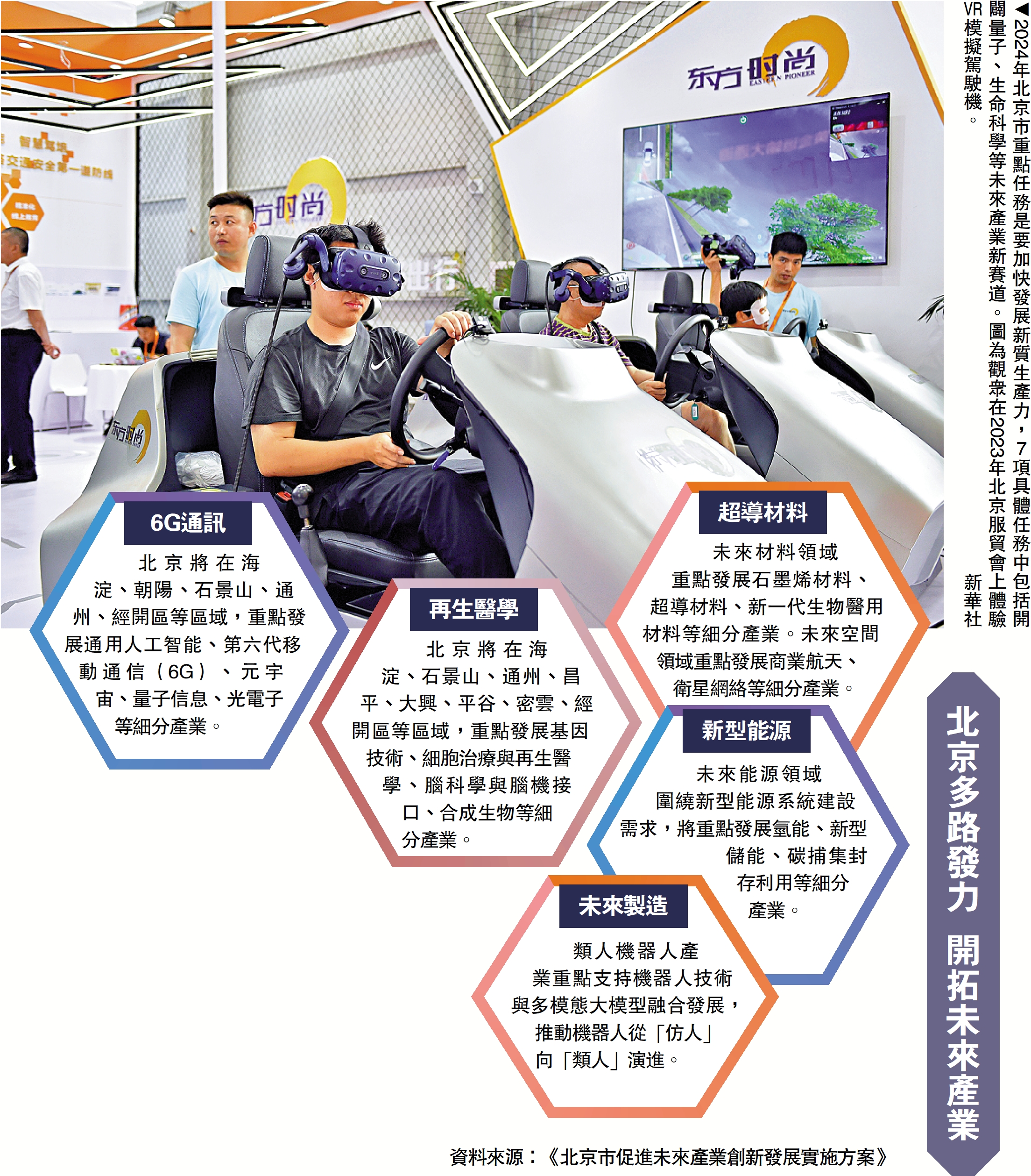 報告提出,去年北京市地區生產總值增長5.2%、約4.4萬億元人民幣,2024年北京市地區生產總值增長5%左右。報告提出,北京市將推進傳統領域「迭代」、新興業態「搶灘」、未來產業「佔先」,並提出北京市加快發展新質生產力的7項具體任務:一,實施製造業重點產業鏈高質量發展行動,提升產業鏈供應鏈韌性和安全水平;二,加快推進集成電路重大項目,在光電集成、芯粒技術等領域實現更大突破;三,加強原創新藥和高端醫療器械研發,培育生物製造等醫藥健康產業新增長點;四,推動新能源汽車產業高質量發展,積極布局電機、電池、電控、車規級芯片等關鍵零部件產業鏈;五,推進超高清視頻全產業鏈優化升級;六,促進新能源、新材料、商業航天、低空經濟等戰略性新興產業發展,開闢量子、生命科學等未來產業新賽道;七,優化專精特新企業梯隊培育體系,助力更多企業發展壯大。