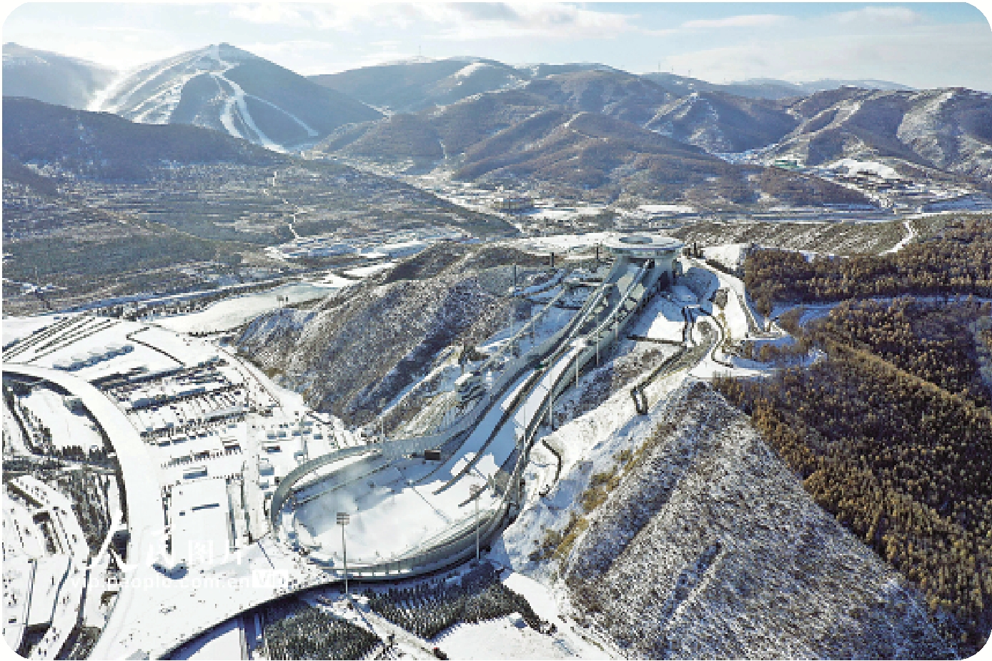 國家跳台滑雪中心由遠而近,到了。它立於海拔千餘米的高山之巔,蔚為壯觀,因幾分神似傳統飾物如意,故別名「雪如意」滑雪場,二○一八年動工,兩年時間建成,工程難度和進度均「當驚世界殊」。這是個圓滿環接的小世界:建在山頂的觀景台是圓形的,大圓套小圓,中間隔出一小圈露天空間;兩條雪道下的場地是圓的,看台也呈碩大的圓狀;加上圓了眾多的人一睹冬奧場地的夢,也構成別樣的奧運五環吧。
