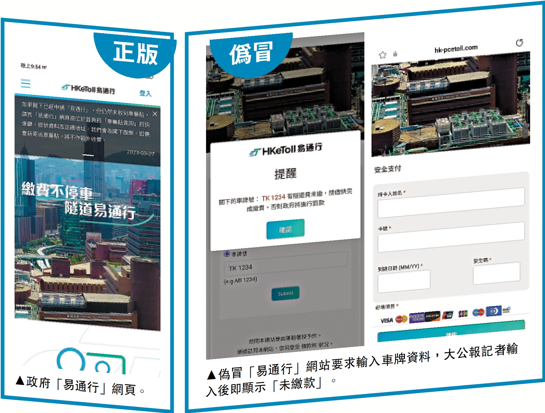 大公報記者昨傍晚實測「易通行」假網站,輸入一個虛構的車牌號碼後,即彈出「隧道費未繳」、「不繳費會被罰款」的通知。網絡安全專家提供小貼士,若已不慎洩露信用卡資料,教你如何自救。\大公報記者 賴振雄