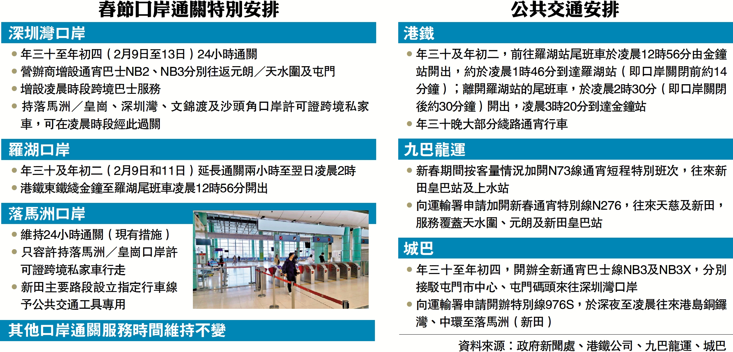 •年三十及年初二(2月9日和11日)延長通關兩小時至翌日凌晨2時