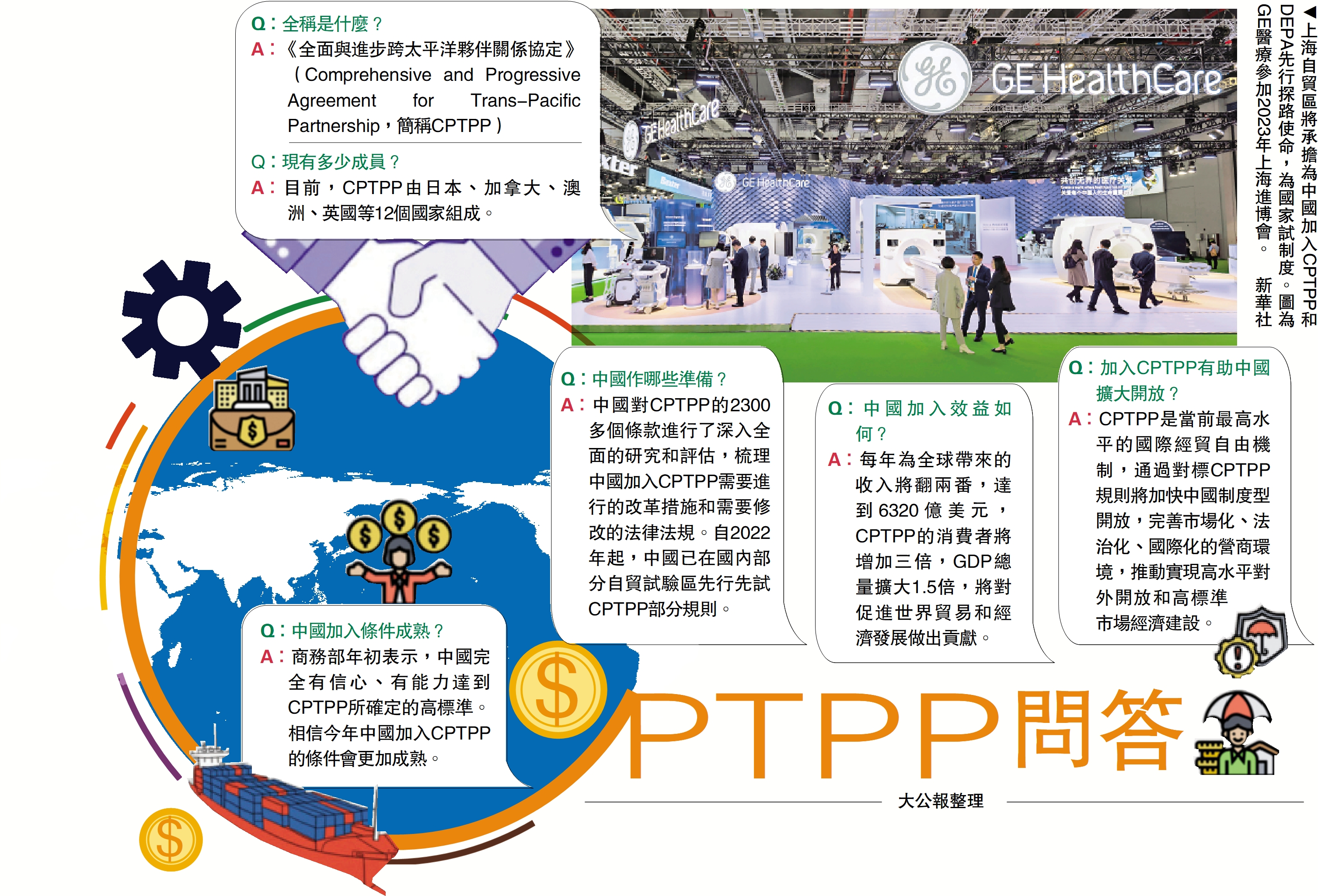 上海市十六屆人大二次會議1月27日閉幕,上海市市長龔正與中外記者見面並回答記者提問。在回答大公報記者有關上海自貿試驗區建設的提問時,龔正介紹,上海自貿區將進一步承擔為中國加入CPTPP(《全面與進步跨太平洋夥伴關係協定》)和DEPA(《數字經濟夥伴關係協定》)先行探路的使命,為國家試制度,加強「邊境」措施對接,爭取在關稅、市場准入等方面率先突破,促進商品、技術、資金、數據等要素跨境高效流動。同時,為改革開放探新路,深化電信、金融、醫療等領域開放,打造更具競爭力的全球服務貿易樞紐節點。\大公報記者 張帆、倪夢璟上海報道