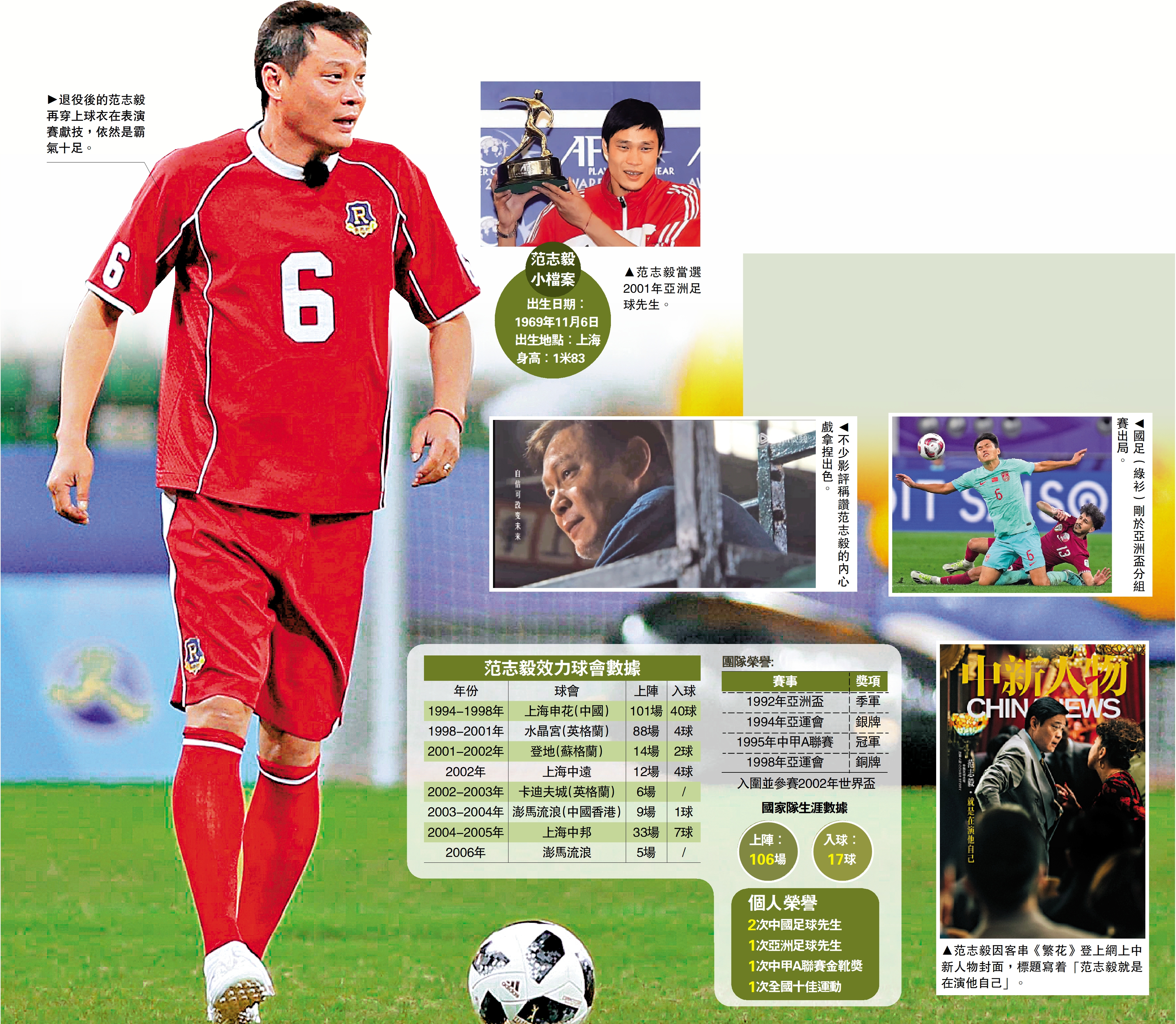上世紀90年代,中國足球職業化改革一路狂奔,甲A聯賽一時熱鬧風光,國足比賽也一直火爆。場上的范志毅非常搶眼,他跑步的時候肩膀些微向上聳起,體態顯得有點緊繃,但他球風很飄逸,配上那個年代普遍寬鬆的球衣,他在球場很是瀟灑。1995年,范志毅迎來爆發,榮膺甲A聯賽金靴,而場外的他用「刺頭」二字形容也不為過,這樣球員人氣不低。