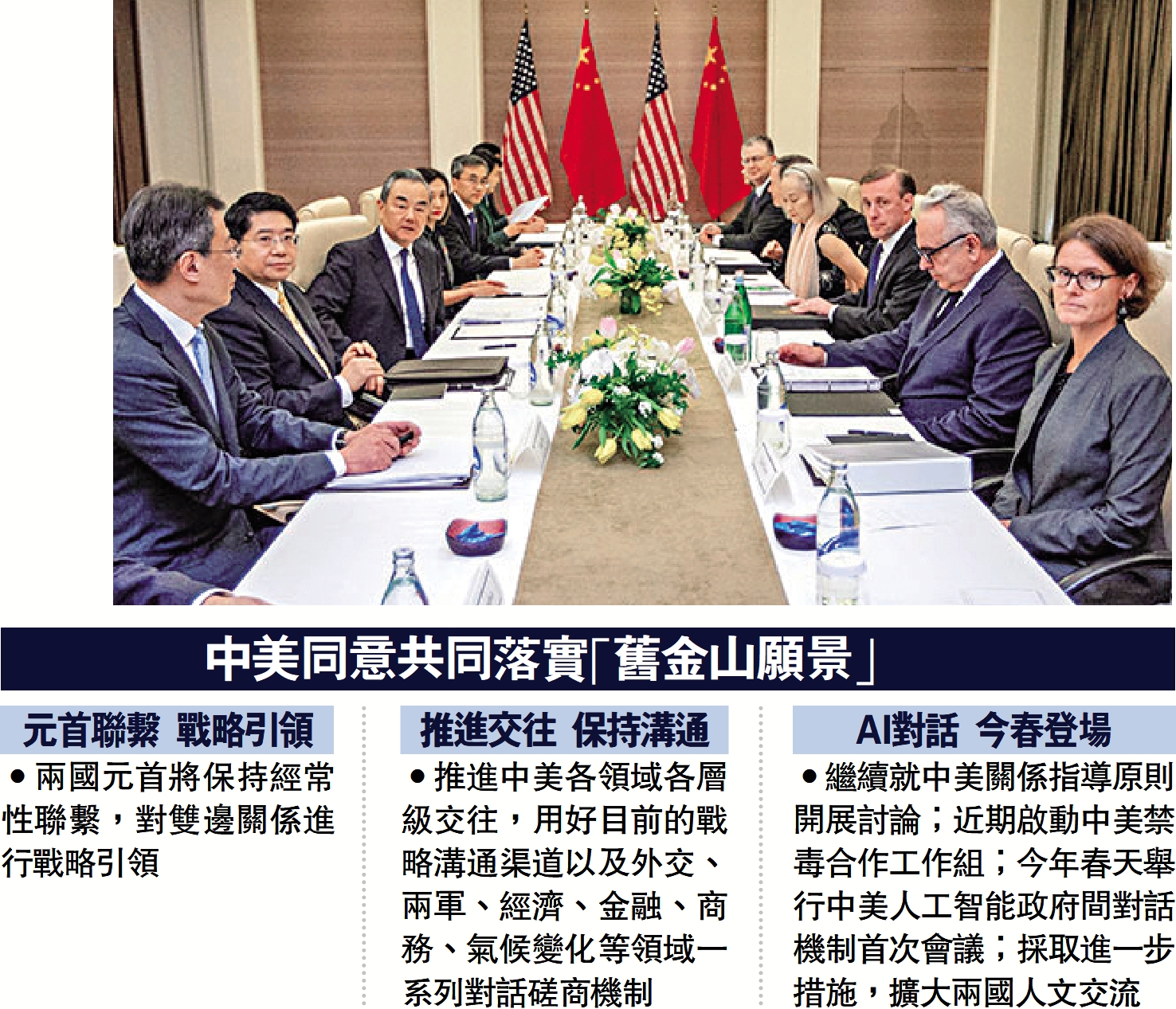 雙方同意共同落實「舊金山願景」:兩國元首將保持經常性聯繫,對雙邊關係進行戰略引領;推進中美各領域各層級交往,用好目前的戰略溝通渠道以及外交、兩軍、經濟、金融、商務、氣候變化等領域一系列對話磋商機制;繼續就中美關係指導原則開展討論;近期啟動中美禁毒合作工作組;今年春天舉行中美人工智能政府間對話機制首次會議;採取進一步措施,擴大兩國人文交流。