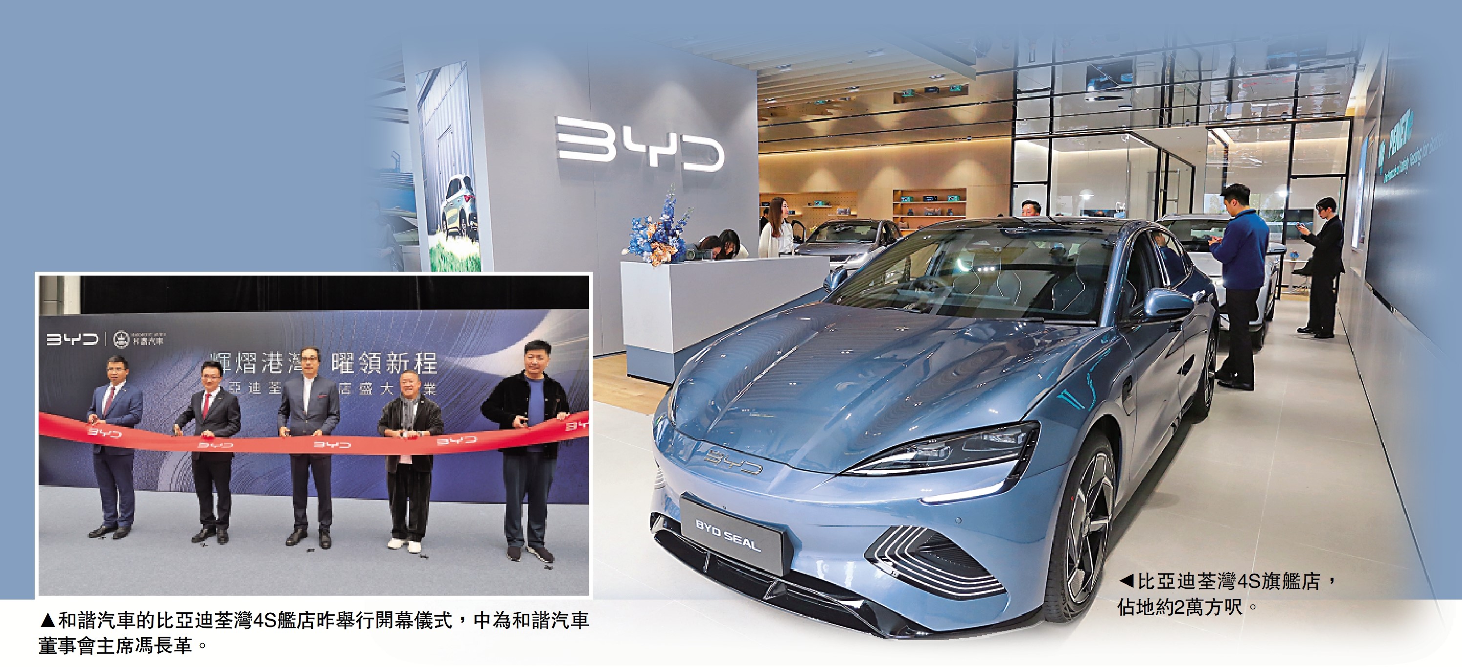 在開幕現場,和諧汽車董事會主席馮長革、歐陽小成、曾志偉、比亞迪亞太汽車銷售事業部總經理助理馮二東、香港特別行政區選舉委員會委員宋嘉桓等為比亞迪荃灣4S旗艦店開幕剪綵。