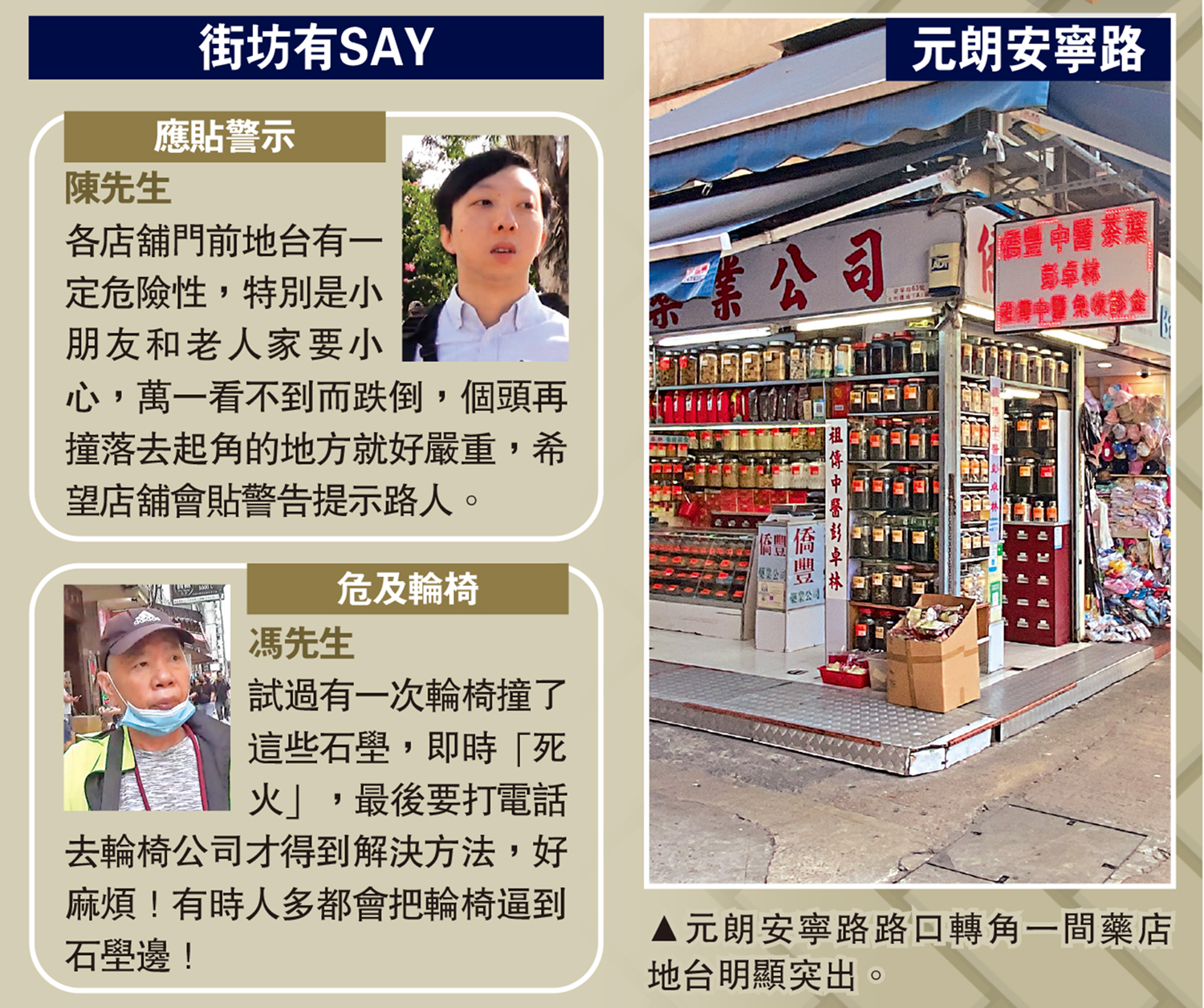 各店舖門前地台有一定危險性,特別是小朋友和老人家要小心,萬一看不到而跌倒,個頭再撞落去起角的地方就好嚴重,希望店舖會貼警告提示路人。