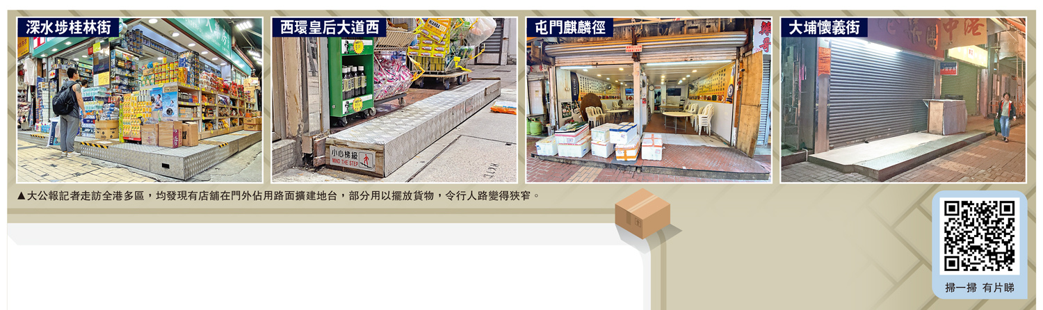 大公報記者近日到港九新界多區鬧市採訪,發現有街舖「僭建」出來的地台面積超過11平方米,高出路面24厘米,有輪椅人士指曾被店舖地台撞到「死車」。有立法會議員表示,店舖用地台霸佔門前官地非法經營十分常見,主要是執法力度不夠、違法成本較輕所導致,執法部門應加重懲處,以儆傚尤,還路於民。\大公報記者 黃山、盛德文、蘇荣(文) 盧剛昌(圖、視頻)