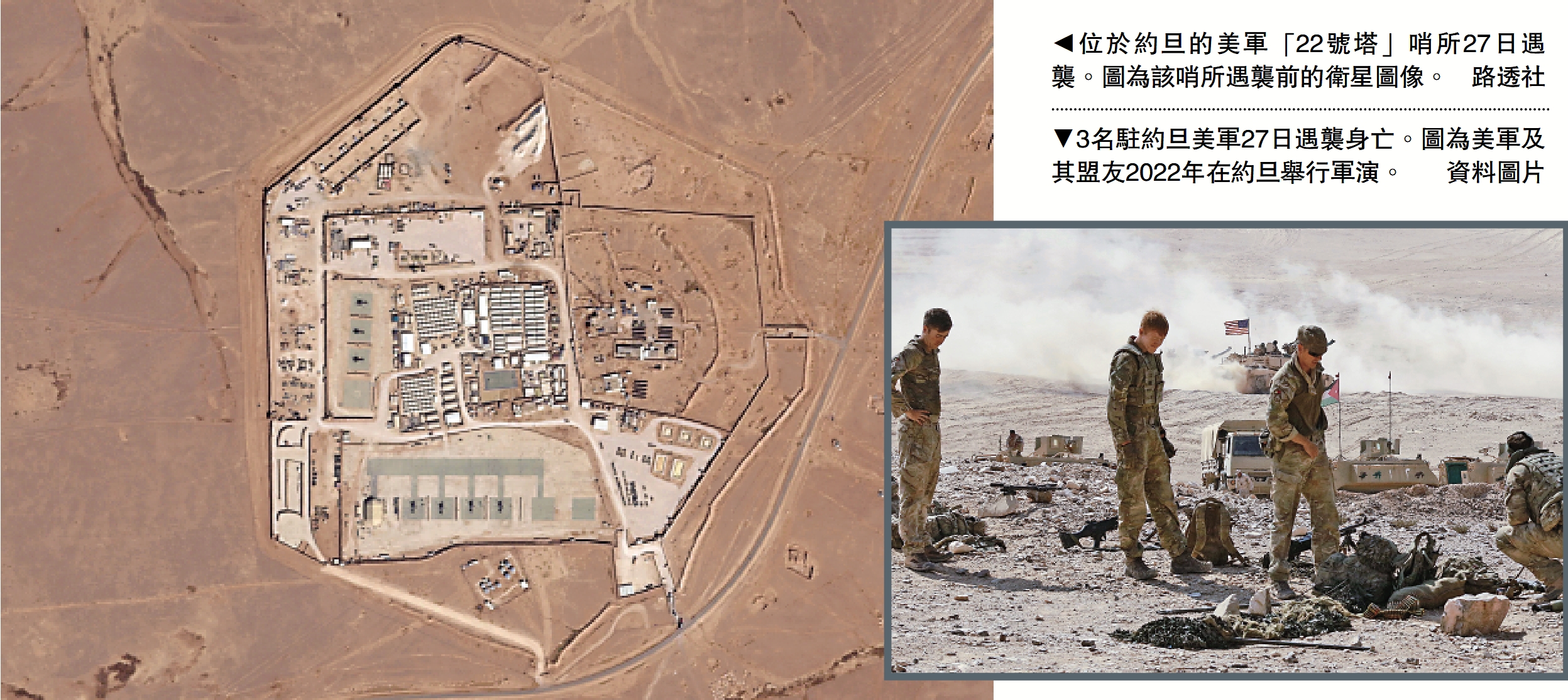 【大公報訊】綜合美聯社、CNN、半島電視台報道:美國中央司令部28日發布消息稱,位於約旦東北部靠近敘利亞邊境的美軍「22號塔」哨所27日遭無人機襲擊,造成3名美軍士兵死亡,至少34人受傷。這是去年10月新一輪巴以衝突爆發以來,首次有駐中東地區美軍遇襲身亡,也是巴以衝突不斷外溢的危險信號。美國總統拜登承諾將「作出回應」,並指控伊朗支持的武裝組織施襲。伊朗否認參與襲擊。巴勒斯坦伊斯蘭抵抗運動(哈馬斯)稱,美軍遇襲是因為美國支持以色列入侵加沙,如今的局面是美國「咎由自取」。