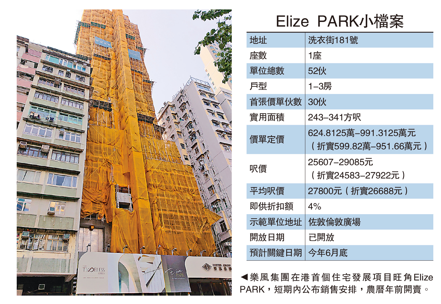 新晉發展商旗下新盤於一手劈價潮下勇敢高開。樂風集團在港首個住宅發展項目旺角Elize PARK,首推30伙,一房折實入場近6球,折實平均呎價高見26688元,貴絕全城,是去年7月黃竹坑海盈山4A期後七個月最貴首批新盤。發展商稱,短期內公布銷售安排,趕及農曆新年前開賣,料是兔年壓軸一擊。\大公報記者 梁穎賢