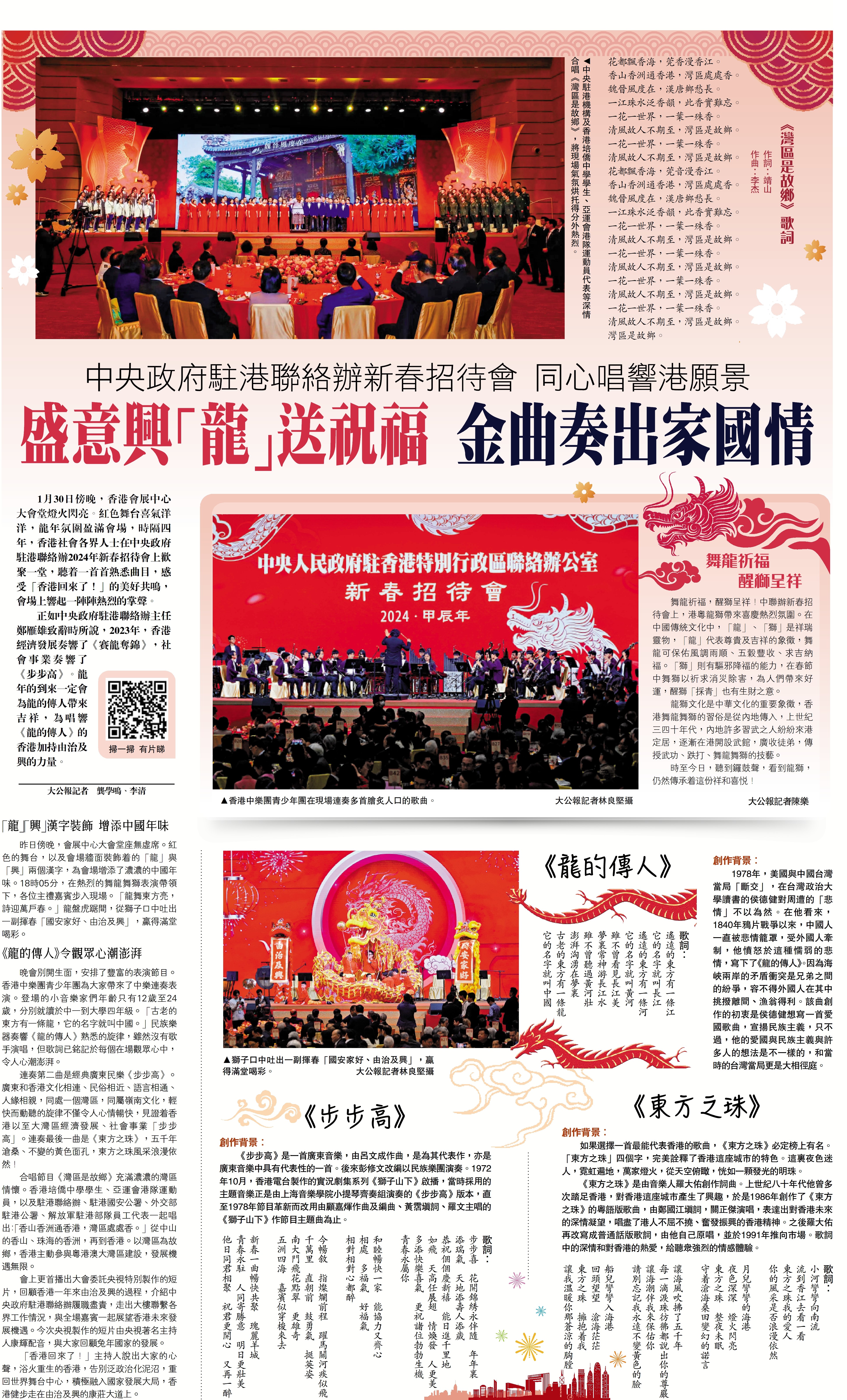 正如中央政府駐港聯絡辦主任鄭雁雄致辭時所說,2023年,香港經濟發展奏響了《賽龍奪錦》,社會事業奏響了《步步高》。龍年的到來一定會為龍的傳人帶來吉祥,為唱響《龍的傳人》的香港加持由治及興的力量。\大公報記者 龔學鳴、李清