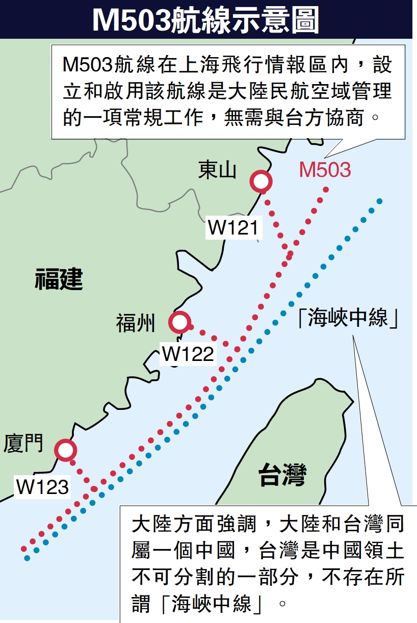 另據中通社報道,台灣「聯合新聞網」報道,2015年1月大陸宣布,基於航空運輸等需求,劃設新的國際民航航線M503,同時啟用M503向西連接浙江東山、福州、廈門的W121、W122、W123的銜接航線。後經兩岸雙方協調,陸方同年3月將航線向西偏移6海里,並於當月底啟用M503航線由北往南飛行,暫不啟用3條銜接航線。2018年1月,大陸再宣布啟用M503北向航線,同時啟用W121、W122、W123由「由東向西」飛行航路。