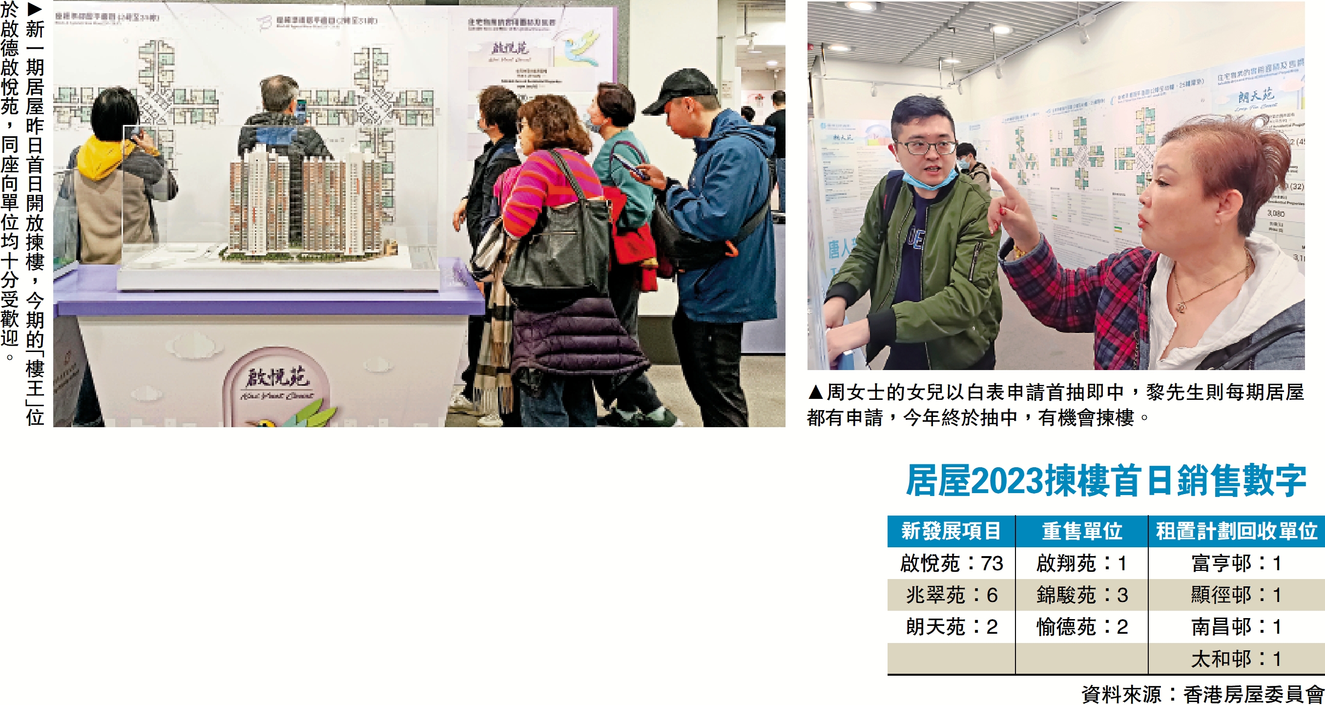 「居屋2023」昨日首日開放揀樓,包括推售啟德、元朗、屯門和觀塘六個新建居屋,合共9154個單位,售價介乎約148萬至494萬元,首日售出91個單位,當中八成來自啟德啟悅苑,包括今期的「樓王」啟悅苑高層大單位,在開售約25分鐘即被認購。