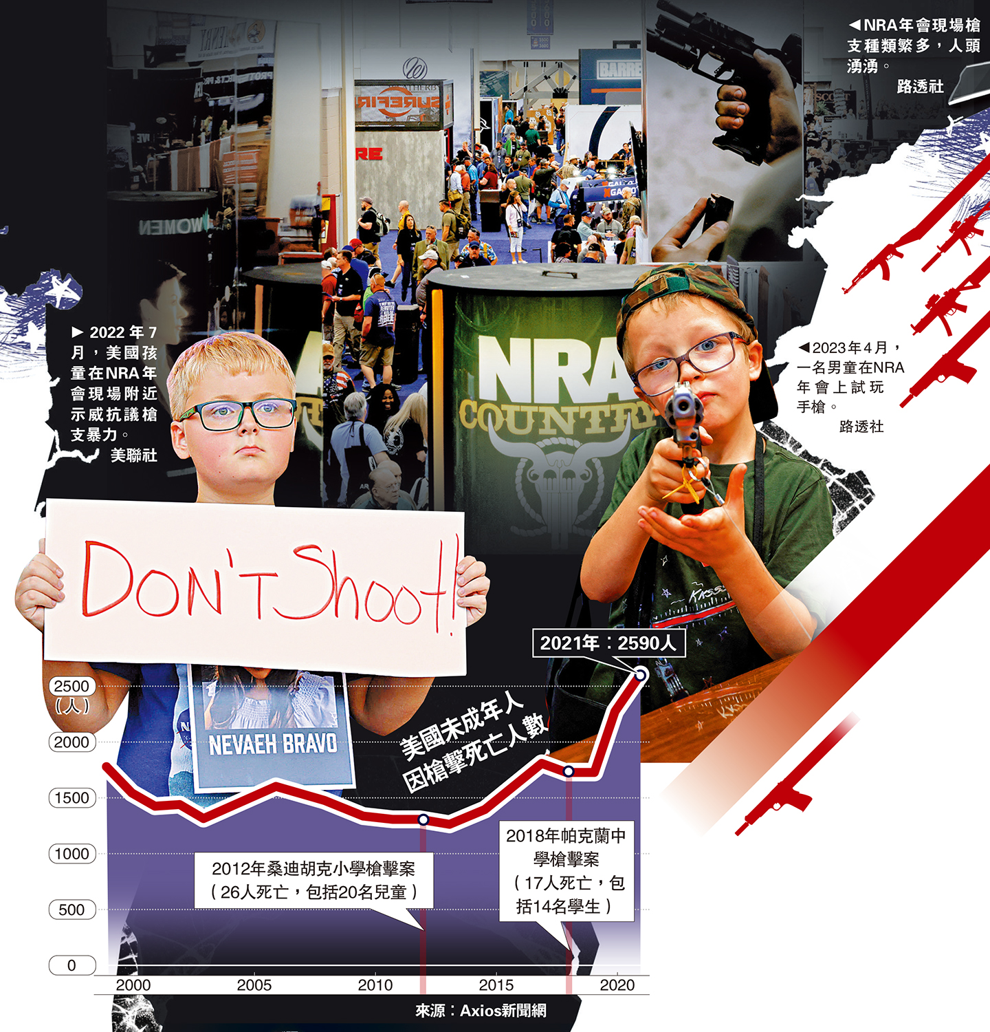自2020年起,槍支暴力已超過交通事故,成為美國兒童死亡的頭號原因。美國疾病控制與預防中心(CDC)發布的最新數據顯示,2021年全美共有2590名18歲以下青少年和兒童死於槍支暴力,創CDC自1999年開始統計這項數據以來的最高紀錄。2019年至2021年,美國因槍支暴力而死亡的未成年人數量激增50%。