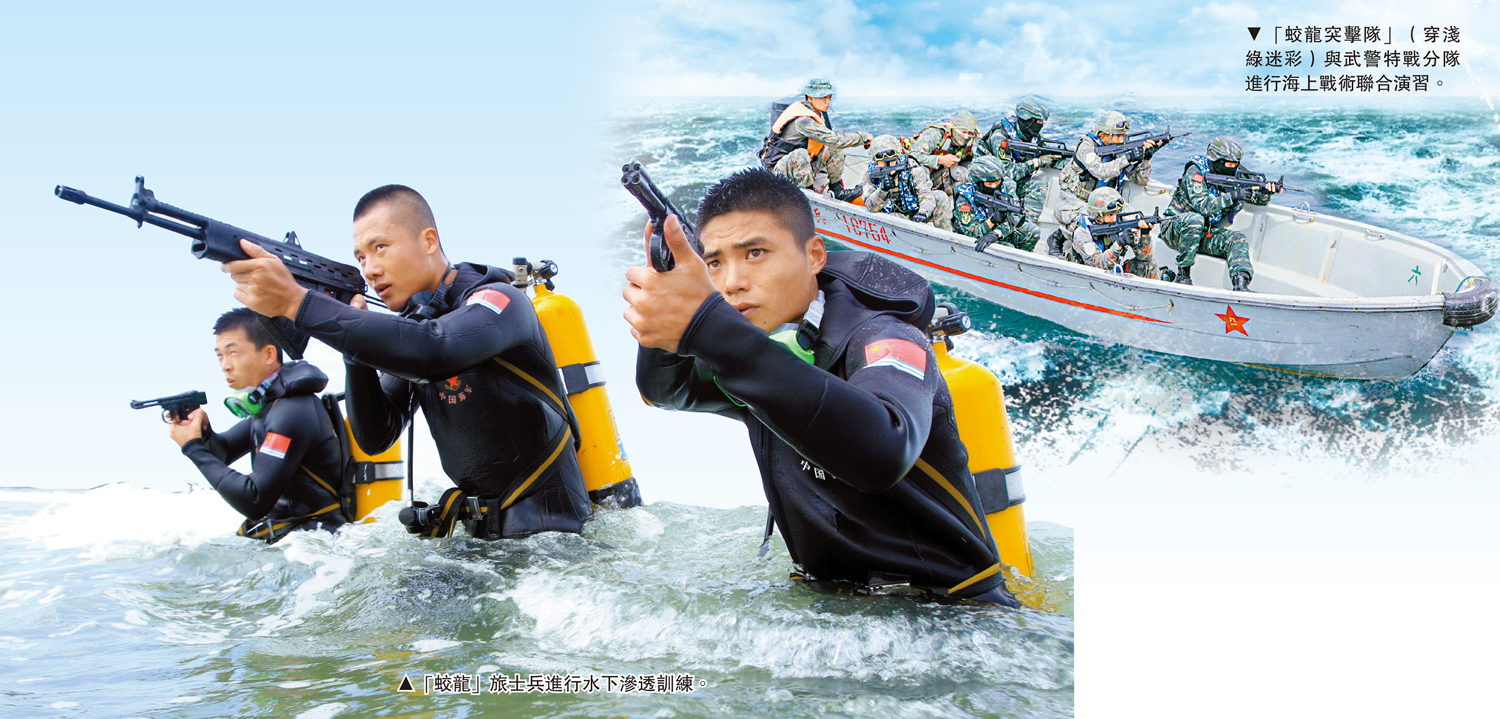 在解放軍17支整建制特戰旅中,有兩支以「龍」命名,凸顯出其渡海奪島登陸的使命定位。這就是陸軍第73集團軍「東海飛龍」旅和海軍陸戰隊「蛟龍」旅,前者擅長與陸航旅聯手超低空隱蔽突入,後者則以水下秘密滲透見稱。每一個特種兵都掌握夜間長距泅渡、潛水、駕駛快艇、攀登絕壁、叢林穿越、孤島生存等技能,單兵素質和小隊作戰能力遠超其他部隊,做到在陸海空「三棲」作戰。\馬浩亮(文)