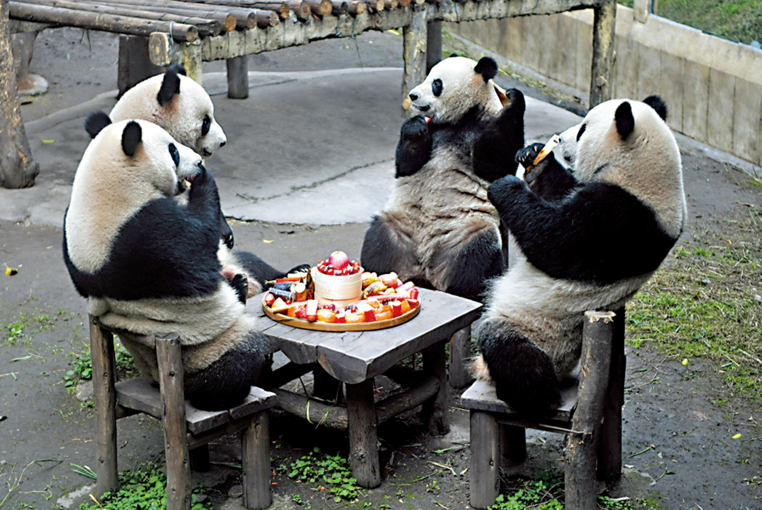 圖:在中國農曆龍年春節即將來臨之際,重慶動物園為大熊貓準備了迎新春特色活動。圖為活動現場,大熊貓「雙雙」「重重」「喜喜」「慶慶」品嘗用竹葉、蘋果、竹筍、胡蘿蔔、西瓜等食材製作的年味大餐。\中新社