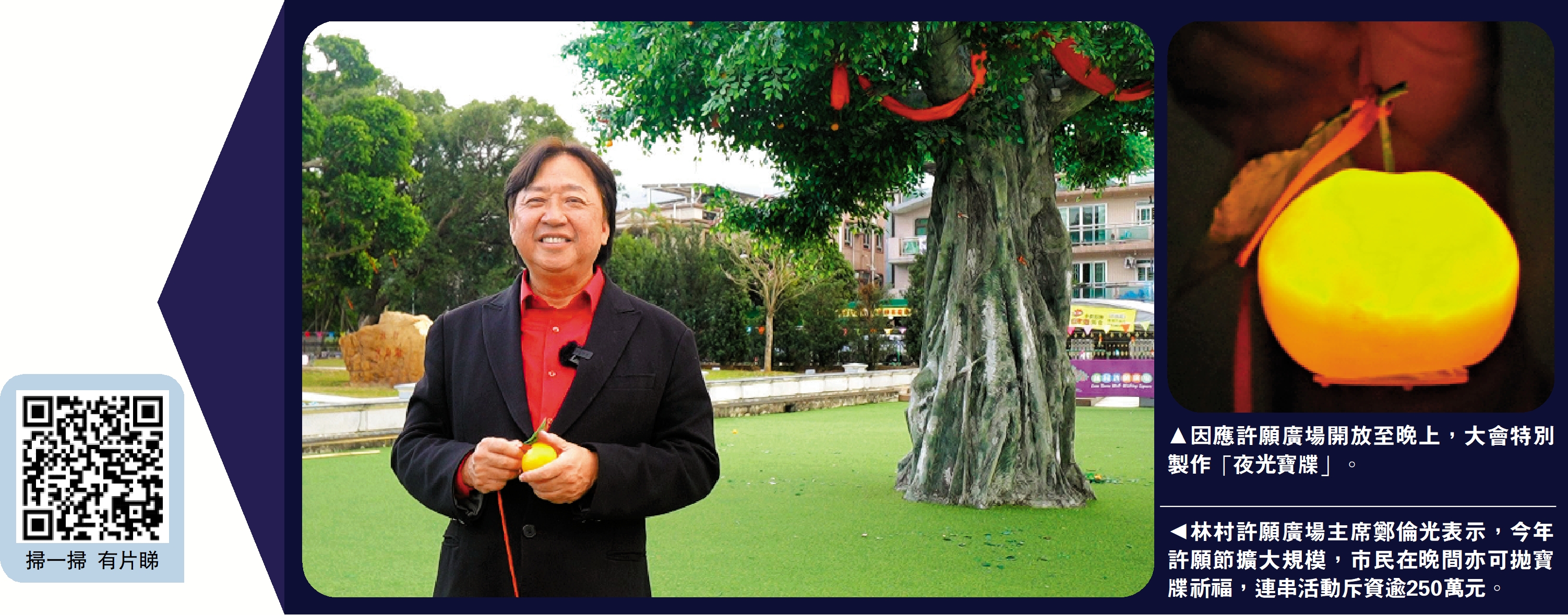 林村許願廣場主席鄭倫光接受《大公報》專訪表示,今年許願節還擴大規模,活動投入逾250萬元,各式攤檔倍增至近100個,預計市民和遊客均會比往年多,冀發揮到振興香港經濟及帶來文化效益的作用。